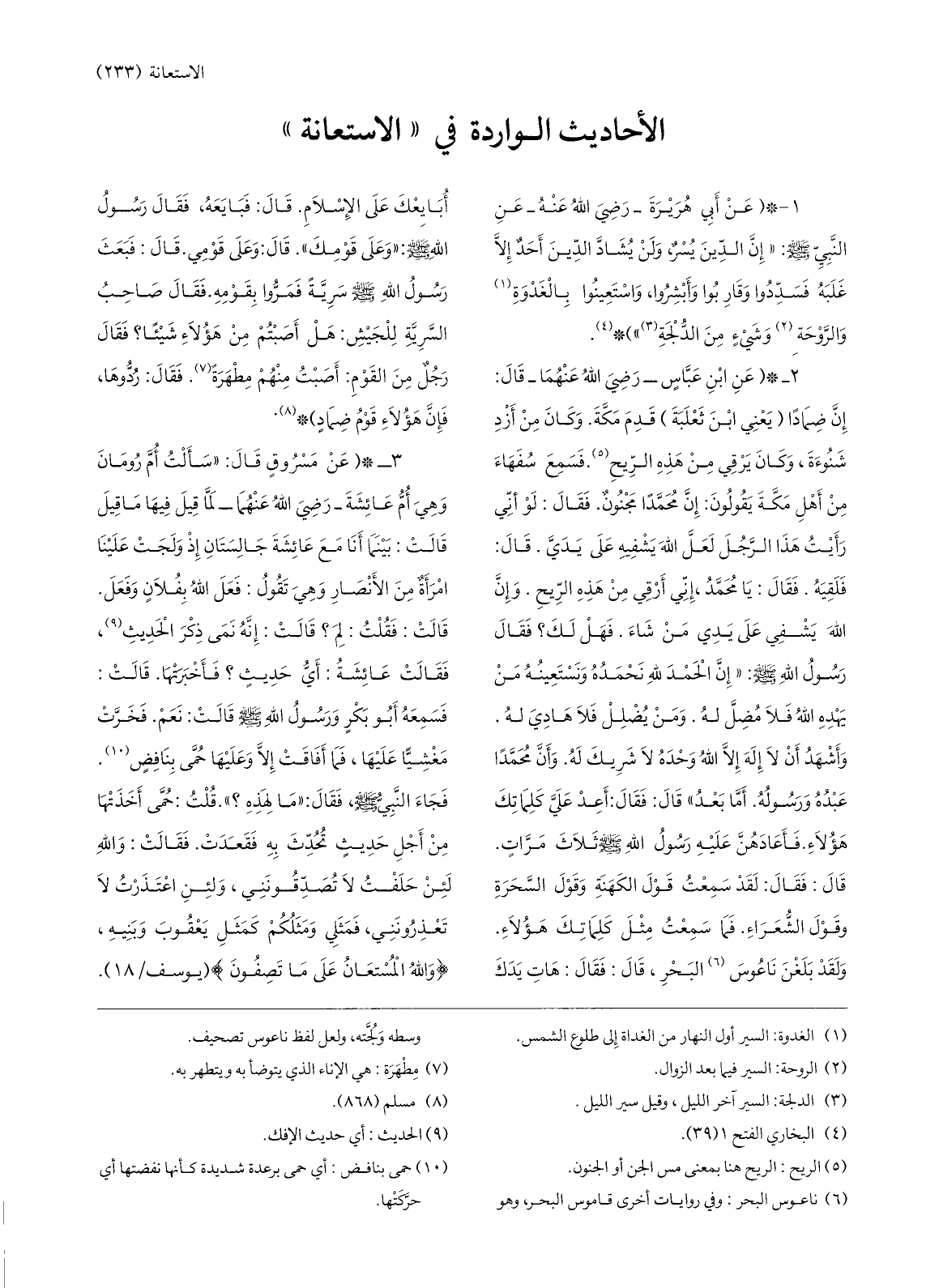 1-* (عن أبي هريرة- رضي الله عنه- عن النّبيّ صلّى الله عليه وسلّم: «إنّ الدّين يسر، ولن يشادّ الدّين أحد إلّا غلبه فسدّدوا وقاربوا وأبشروا، واستعينوا بالغدوة «1» والرّوحة «2» وشيء من الدّلجة «3» » ) * «4» .