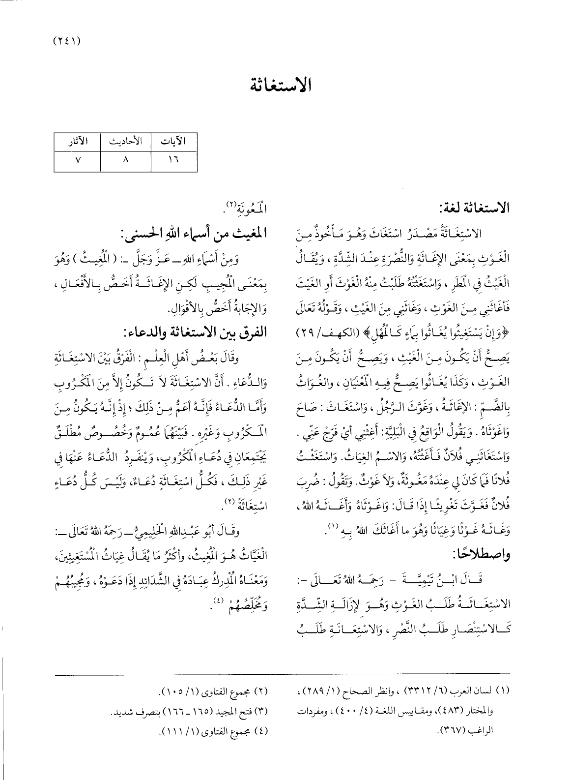 وقال بعض أهل العلم: الفرق بين الاستغاثة والدّعاء. أنّ الاستغاثة لا تكون إلّا من المكروب وأمّا الدّعاء فإنّه أعمّ من ذلك؛ إذ إنّه يكون من المكروب وغيره. فبينهما عموم وخصوص مطلق يجتمعان في دعاء المكروب، وينفرد الدّعاء عنها في غير ذلك، فكلّ استغاثة دعاء، وليس كلّ دعاء استغاثة «3» .