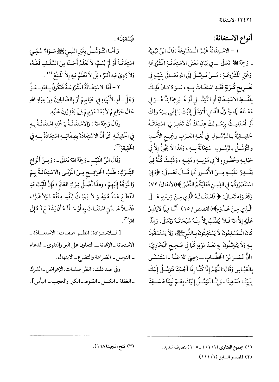 1- الاستغاثة غير المشروعة: قال ابن تيميّة رحمه الله تعالى- في بيان معنى الاستغاثة المشروعة وغير المشروعة: من توسّل إلى الله تعالى بنبيّه في تفريج كربة فقد استغاث به، سواء كان ذلك بلفظ الاستغاثة أو التّوسّل أو غيرهما ممّا هو في معناهما، وقول القائل: أتوسّل إليك يا إلهي برسولك أو أستغيث برسولك عندك أن تغفر لي: استغاثة حقيقيّة بالرّسول في لغة العرب وجميع الأمم، والتّوسّل بالرّسول استغاثة به، وهذا لا يجوز إلّا في حياته وحضوره لا في موته ومغيبه، وذلك كلّه فيما يقدر عليه من الأمور كما قال تعالى: وَإِنِ اسْتَنْصَرُوكُمْ فِي الدِّينِ فَعَلَيْكُمُ النَّصْرُ (الأنفال/ 72) وكقوله تعالى: فَاسْتَغاثَهُ الَّذِي مِنْ شِيعَتِهِ عَلَى الَّذِي مِنْ عَدُوِّهِ (القصص/ 15) . أمّا فيما لا يقدر عليه إلّا الله فلا يطلب إلّا منه سبحانه وتعالى. ولهذا كان المسلمون لا يستغيثون بالنّبيّ صلّى الله عليه وسلّم، ولا يستسقون به ولا يتوسّلون به بعد موته كما في صحيح البخاريّ: