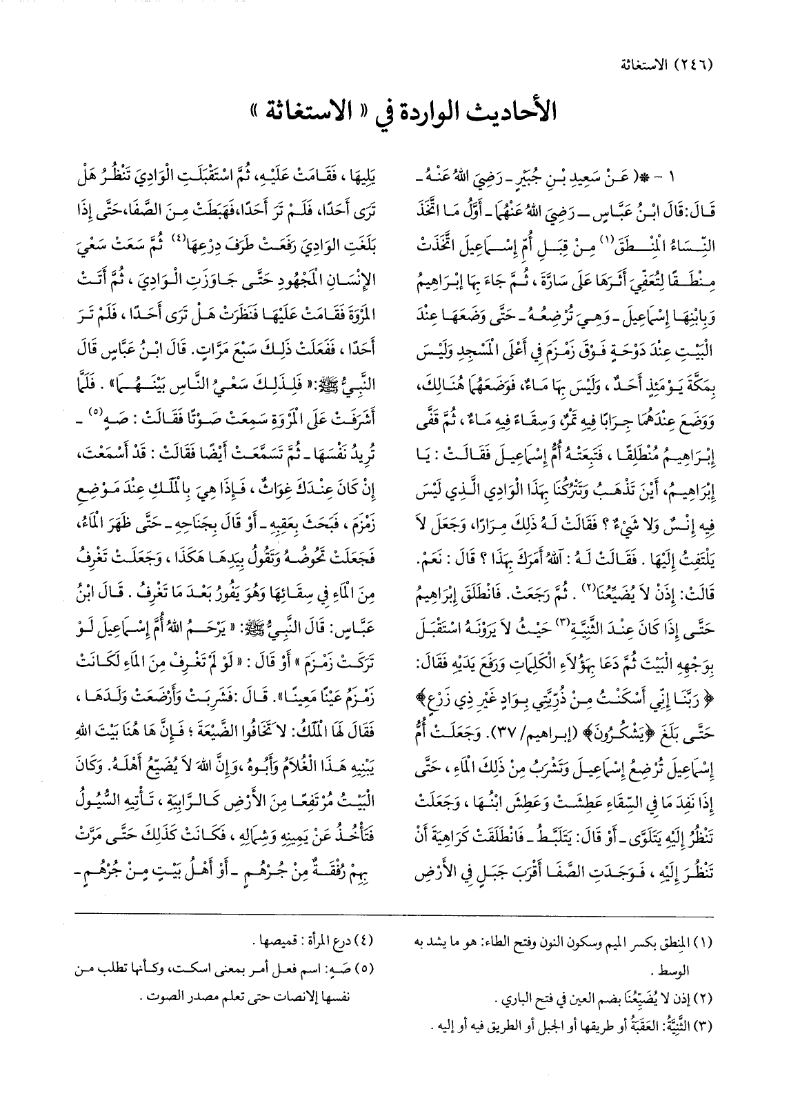 1-* (عن سعيد بن جبير- رضي الله عنه- قال: قال ابن عبّاس- رضي الله عنهما- أوّل ما اتّخذ النّساء المنطق «1» من قبل أمّ إسماعيل اتّخذت منطقا لتعفّي أثرها على سارّة، ثمّ جاء بها إبراهيم وبابنها إسماعيل- وهي ترضعه- حتّى وضعها عند البيت عند دوحة فوق زمزم في أعلى المسجد وليس بمكّة يومئذ أحد، وليس بها ماء، فوضعهما هنالك، ووضع عندهما جرابا فيه تمر، وسقاء فيه ماء، ثمّ قفّى إبراهيم منطلقا، فتبعته أمّ إسماعيل فقالت: يا إبراهيم، أين تذهب وتتركنا بهذا الوادي الّذي ليس فيه إنس ولا شيء؟ فقالت له ذلك مرارا، وجعل لا يلتفت إليها.