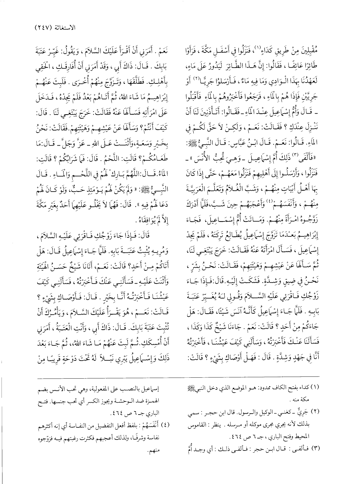(3) فألفى: قال ابن حجر: فألفى ذلك: أي وجد أمّ إسماعيل بالنصب على المفعولية، وهي تحب الأنس بضم الهمزة ضد الوحشة ويجوز الكسر أي تحب جنسها. فتح الباري ج 6 ص 464.