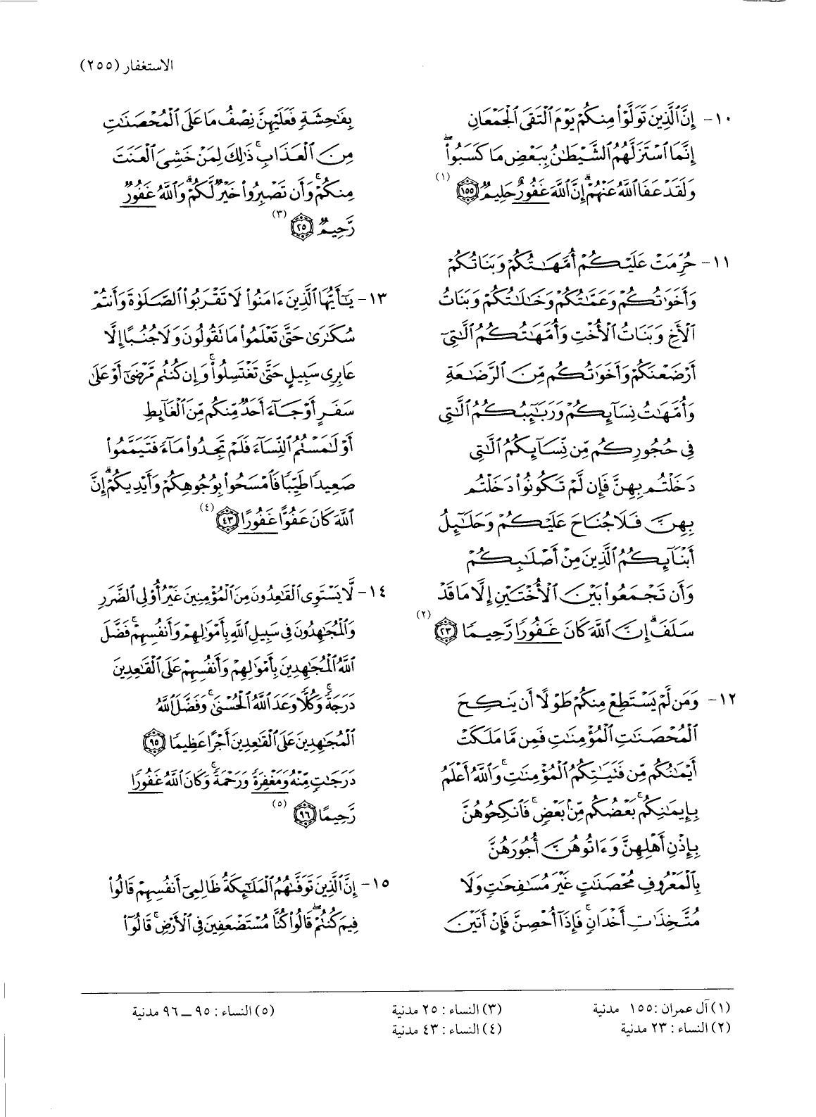 11- حُرِّمَتْ عَلَيْكُمْ أُمَّهاتُكُمْ وَبَناتُكُمْ وَأَخَواتُكُمْ وَعَمَّاتُكُمْ وَخالاتُكُمْ وَبَناتُ الْأَخِ وَبَناتُ الْأُخْتِ وَأُمَّهاتُكُمُ اللَّاتِي أَرْضَعْنَكُمْ وَأَخَواتُكُمْ مِنَ الرَّضاعَةِ وَأُمَّهاتُ نِسائِكُمْ وَرَبائِبُكُمُ اللَّاتِي فِي حُجُورِكُمْ مِنْ نِسائِكُمُ اللَّاتِي دَخَلْتُمْ بِهِنَّ فَإِنْ لَمْ تَكُونُوا دَخَلْتُمْ بِهِنَّ فَلا جُناحَ عَلَيْكُمْ وَحَلائِلُ أَبْنائِكُمُ الَّذِينَ مِنْ أَصْلابِكُمْ وَأَنْ تَجْمَعُوا بَيْنَ الْأُخْتَيْنِ إِلَّا ما قَدْ سَلَفَ إِنَّ اللَّهَ كانَ غَفُوراً رَحِيماً (23) «2»