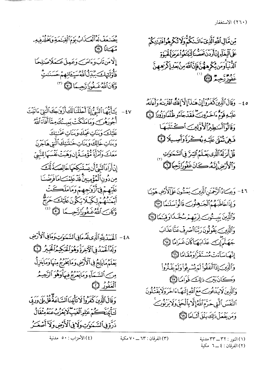 46- وَعِبادُ الرَّحْمنِ الَّذِينَ يَمْشُونَ عَلَى الْأَرْضِ هَوْناً وَإِذا خاطَبَهُمُ الْجاهِلُونَ قالُوا سَلاماً (63) وَالَّذِينَ يَبِيتُونَ لِرَبِّهِمْ سُجَّداً وَقِياماً (64) وَالَّذِينَ يَقُولُونَ رَبَّنَا اصْرِفْ عَنَّا عَذابَ جَهَنَّمَ إِنَّ عَذابَها كانَ غَراماً (65) إِنَّها ساءَتْ مُسْتَقَرًّا وَمُقاماً (66) وَالَّذِينَ إِذا أَنْفَقُوا لَمْ يُسْرِفُوا وَلَمْ يَقْتُرُوا وَكانَ بَيْنَ ذلِكَ قَواماً (67) وَالَّذِينَ لا يَدْعُونَ مَعَ اللَّهِ إِلهاً آخَرَ وَلا يَقْتُلُونَ النَّفْسَ الَّتِي حَرَّمَ اللَّهُ إِلَّا بِالْحَقِّ وَلا يَزْنُونَ وَمَنْ يَفْعَلْ ذلِكَ يَلْقَ أَثاماً (68) يُضاعَفْ لَهُ الْعَذابُ يَوْمَ الْقِيامَةِ وَيَخْلُدْ فِيهِ مُهاناً (69) إِلَّا مَنْ تابَ وَآمَنَ وَعَمِلَ عَمَلًا صالِحاً فَأُوْلئِكَ يُبَدِّلُ اللَّهُ سَيِّئاتِهِمْ حَسَناتٍ وَكانَ اللَّهُ غَفُوراً رَحِيماً