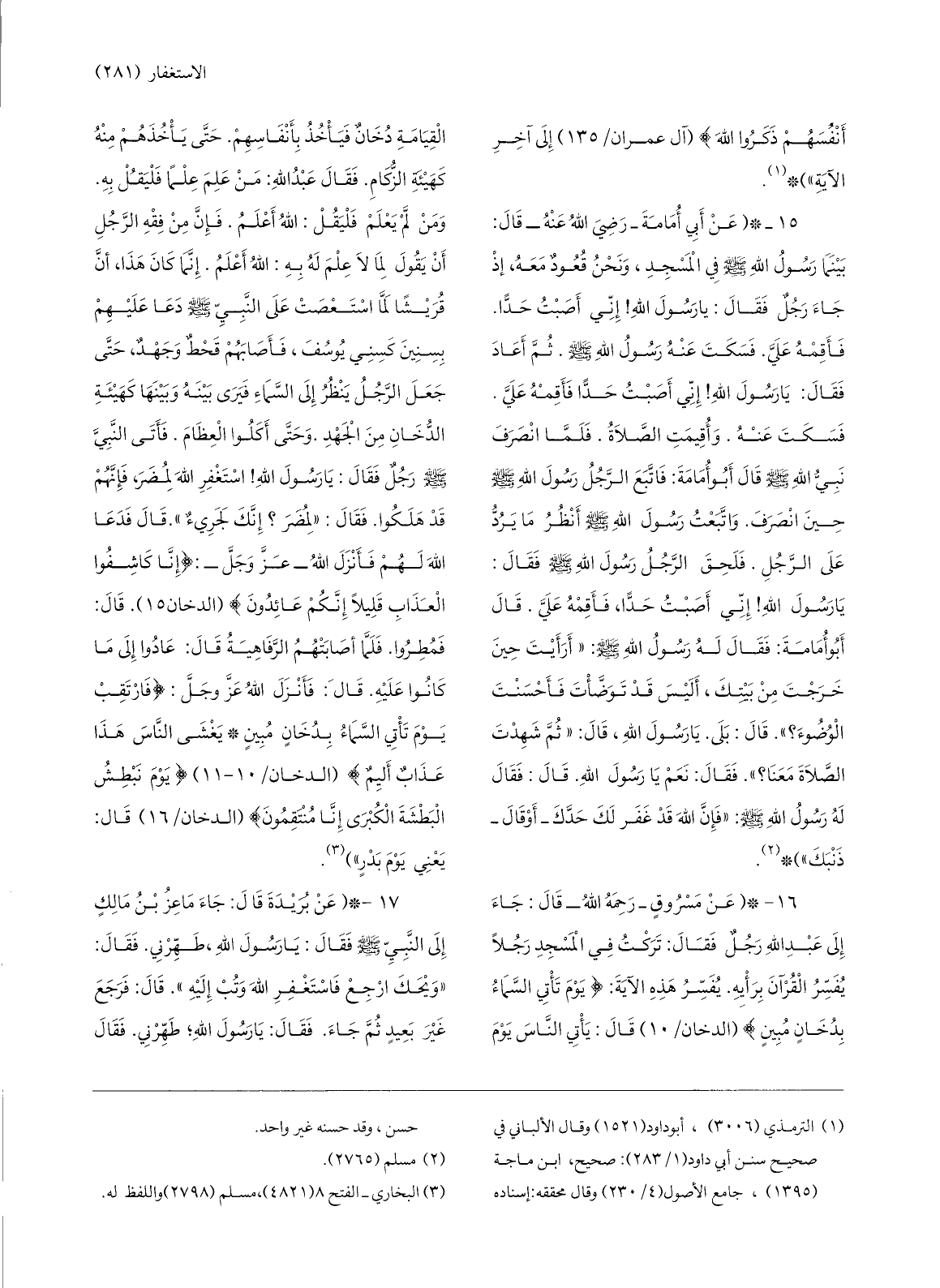 15-* (عن أبي أمامة- رضي الله عنه- قال: بينما رسول الله صلّى الله عليه وسلّم في المسجد، ونحن قعود معه، إذ جاء رجل فقال: يا رسول الله! إنّي أصبت حدّا. فأقمه عليّ. فسكت عنه رسول الله صلّى الله عليه وسلّم. ثمّ أعاد فقال: يا رسول الله! إنّي أصبت حدّا فأقمه عليّ. فسكت عنه. وأقيمت الصّلاة. فلمّا انصرف نبيّ الله صلّى الله عليه وسلّم قال أبو أمامة: فاتّبع الرّجل رسول الله صلّى الله عليه وسلّم حين انصرف. واتّبعت رسول الله صلّى الله عليه وسلّم أنظر ما يردّ على الرّجل. فلحق الرّجل رسول الله صلّى الله عليه وسلّم فقال: يا رسول الله! إنّي أصبت حدّا، فأقمه عليّ.