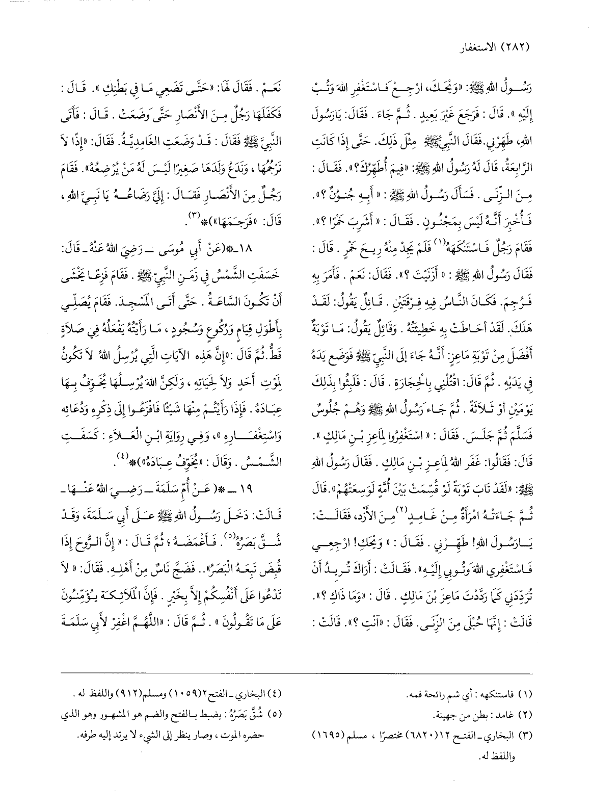 فاستغفر الله وتب إليه» . قال: فرجع غير بعيد. ثمّ جاء. فقال: يا رسول الله، طهّرني. فقال النّبيّ صلّى الله عليه وسلّم مثل ذلك. حتّى إذا كانت الرّابعة، قال له رسول الله صلّى الله عليه وسلّم: «فيم أطهّرك؟» . فقال: من الزّنى. فسأل رسول الله صلّى الله عليه وسلّم: «أبه جنون؟» . فأخبر أنّه ليس بمجنون. فقال: «أشرب خمرا؟» . فقام رجل فاستنكهه «1» فلم يجد منه ريح خمر. قال: فقال رسول الله صلّى الله عليه وسلّم: «أزنيت؟» . فقال: نعم. فأمر به فرجم.