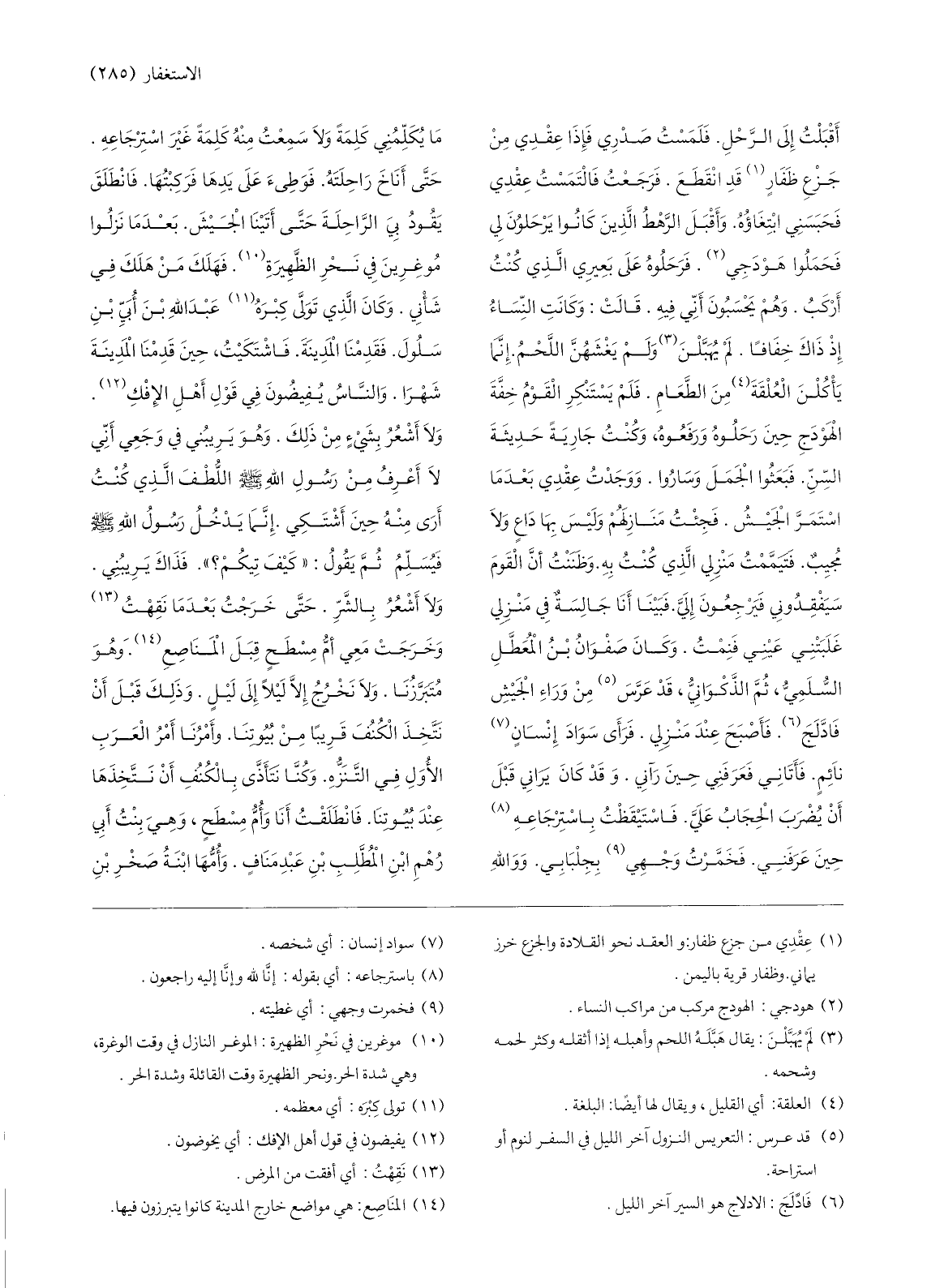 فجئت منازلهم وليس بها داع ولا مجيب. فتيمّمت منزلي الّذي كنت به. وظننت أنّ القوم سيفقدوني فيرجعون إليّ. فبينا أنا جالسة في منزلي غلبتني عيني فنمت. وكان صفوان بن المعطّل السّلميّ، ثمّ الذّكوانيّ، قد عرّس»