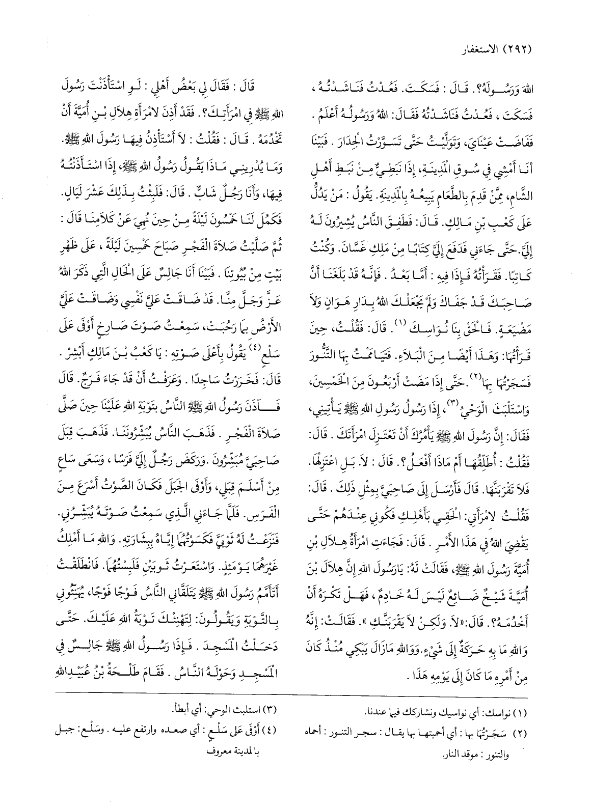 ففاضت عيناي، وتولّيت حتّى تسوّرت الجدار. فبينا أنا أمشي في سوق المدينة، إذا نبطيّ من نبط أهل الشّام، ممّن قدم بالطّعام يبيعه بالمدينة. يقول: من يدلّ على كعب بن مالك. قال: فطفق النّاس يشيرون له إليّ. حتّى جاءني فدفع إليّ كتابا من ملك غسّان. وكنت كاتبا. فقرأته فإذا فيه: أمّا بعد. فإنّه قد بلغنا أنّ صاحبك قد جفاك ولم يجعلك الله بدار هوان ولا مضيعة. فالحق بنا نواسك «1» . قال: فقلت، حين قرأتها: وهذا أيضا من البلاء. فتياممت بها التّنّور فسجرتها بها «2» . حتّى إذا مضت أربعون من الخمسين، واستلبث الوحي «3» ، إذا رسول الله صلّى الله عليه وسلّم يأتيني، فقال: إنّ رسول الله صلّى الله عليه وسلّم يأمرك أن تعزل امرأتك.