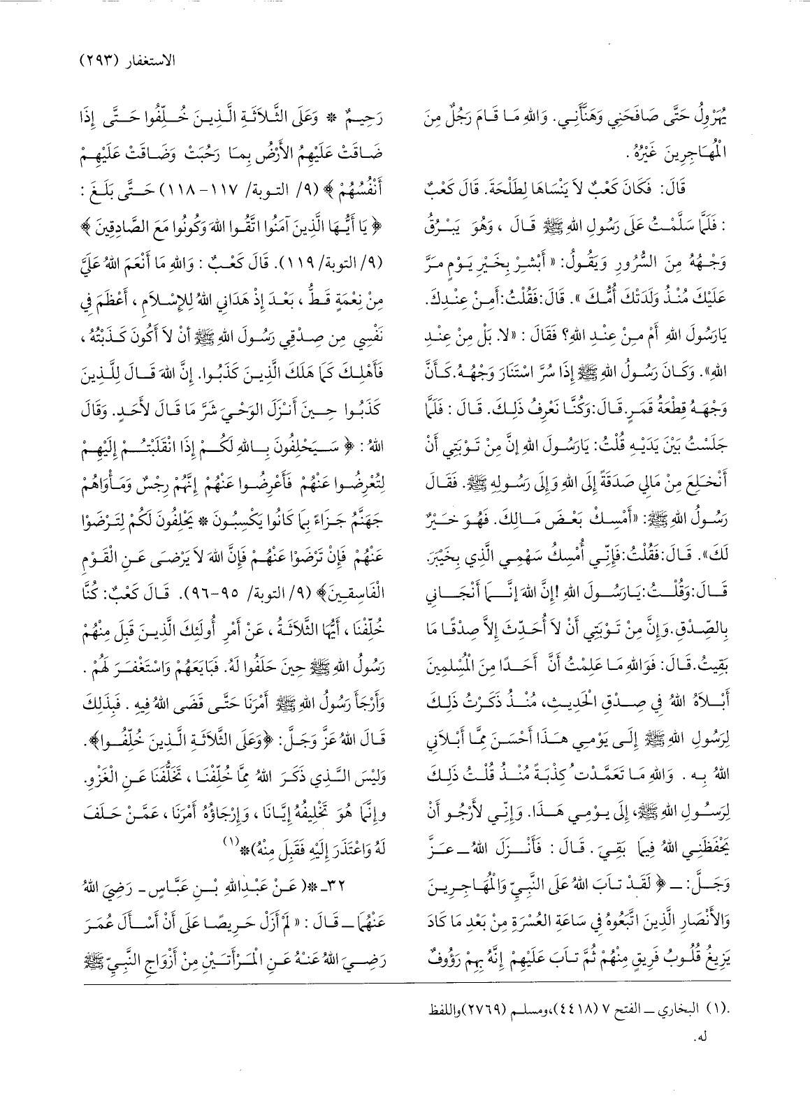 فهو خير لك» . قال: فقلت: فإنّي أمسك سهمي الّذي بخيبر. قال: وقلت: يا رسول الله! إنّ الله إنّما أنجاني بالصّدق. وإنّ من توبتي أن لا أحدّث إلّا صدقا ما بقيت. قال: فو الله ما علمت أنّ أحدا من المسلمين أبلاه الله في صدق الحديث، منذ ذكرت ذلك لرسول الله صلّى الله عليه وسلّم إلى يومي هذا أحسن ممّا أبلاني الله به. والله ما تعمّدت كذبة منذ قلت ذلك لرسول الله صلّى الله عليه وسلّم، إلى يومي هذا. وإنّي لأرجو أن يحفظني الله فيما بقي. قال: فأنزل الله- عزّ وجلّ-: لَقَدْ تابَ اللَّهُ عَلَى النَّبِيِّ وَالْمُهاجِرِينَ وَالْأَنْصارِ الَّذِينَ اتَّبَعُوهُ فِي ساعَةِ الْعُسْرَةِ مِنْ بَعْدِ ما كادَ يَزِيغُ قُلُوبُ فَرِيقٍ مِنْهُمْ ثُمَّ تابَ عَلَيْهِمْ إِنَّهُ بِهِمْ رَؤُفٌ رَحِيمٌ* وَعَلَى الثَّلاثَةِ الَّذِينَ خُلِّفُوا حَتَّى إِذا ضاقَتْ عَلَيْهِمُ الْأَرْضُ بِما رَحُبَتْ وَضاقَتْ عَلَيْهِمْ أَنْفُسُهُمْ (9/ التوبة/ 117- 118) حتّى بلغ: