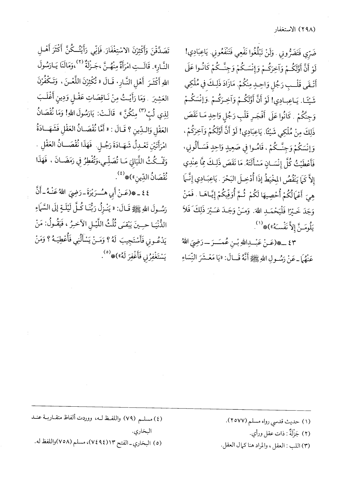 43-* (عن عبد الله بن عمر- رضي الله عنهما. عن رسول الله صلّى الله عليه وسلّم أنّه قال: «يا معشر النّساء تصدّقن وأكثرن الاستغفار. فإنّي رأيتكنّ أكثر أهل النّار» . قالت امرأة منهنّ، جزلة «2» ، وما لنا يا رسول الله أكثر أهل النّار. قال «تكثرن اللّعن، وتكفرن العشير. وما رأيت من ناقصات عقل ودين أغلب لذي لبّ «3» منكنّ» قالت: يا رسول الله! وما نقصان العقل والدّين؟ قال: «أمّا نقصان العقل فشهادة امرأتين تعدل شهادة رجل. فهذا نقصان العقل.