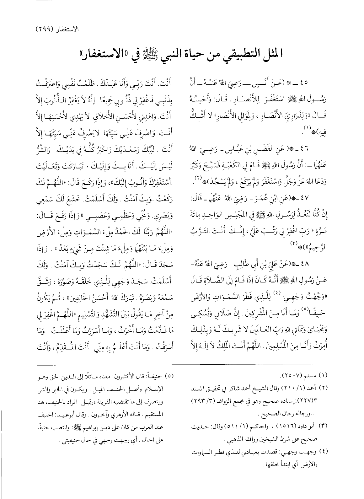 48-* (عن عليّ بن أبي طالب- رضي الله عنه- عن رسول الله صلّى الله عليه وسلّم أنّه كان إذا قام إلى الصّلاة قال «وجّهت وجهي «4» للّذي فطر السّموات والأرض حنيفا «5» وما أنا من المشركين. إنّ صلاتي ونسكي ومحياي ومماتي لله ربّ العالمين لا شريك له وبذلك أمرت وأنا من المسلمين. اللهمّ أنت الملك لا إله إلّا أنت. أنت ربّي وأنا عبدك. ظلمت نفسي واعترفت بذنبي فاغفر لي ذنوبي جميعا. إنّه لا يغفر الذّنوب إلّا أنت. واهدني لأحسن الأخلاق لا يهدي لأحسنها إلّا أنت. واصرف عنّي سيّئها لا يصرف عنّي سيّئها إلّا أنت. لبّيك وسعديك والخير كلّه في يديك. والشّرّ ليس إليك. أنا بك وإليك. تباركت وتعاليت.