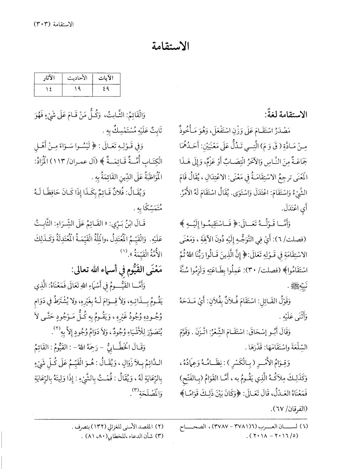 وفي قوله تعالى: لَيْسُوا سَواءً مِنْ أَهْلِ الْكِتابِ أُمَّةٌ قائِمَةٌ (آل عمران/ 113) المراد: المواظبة على الدّين القائمة به.