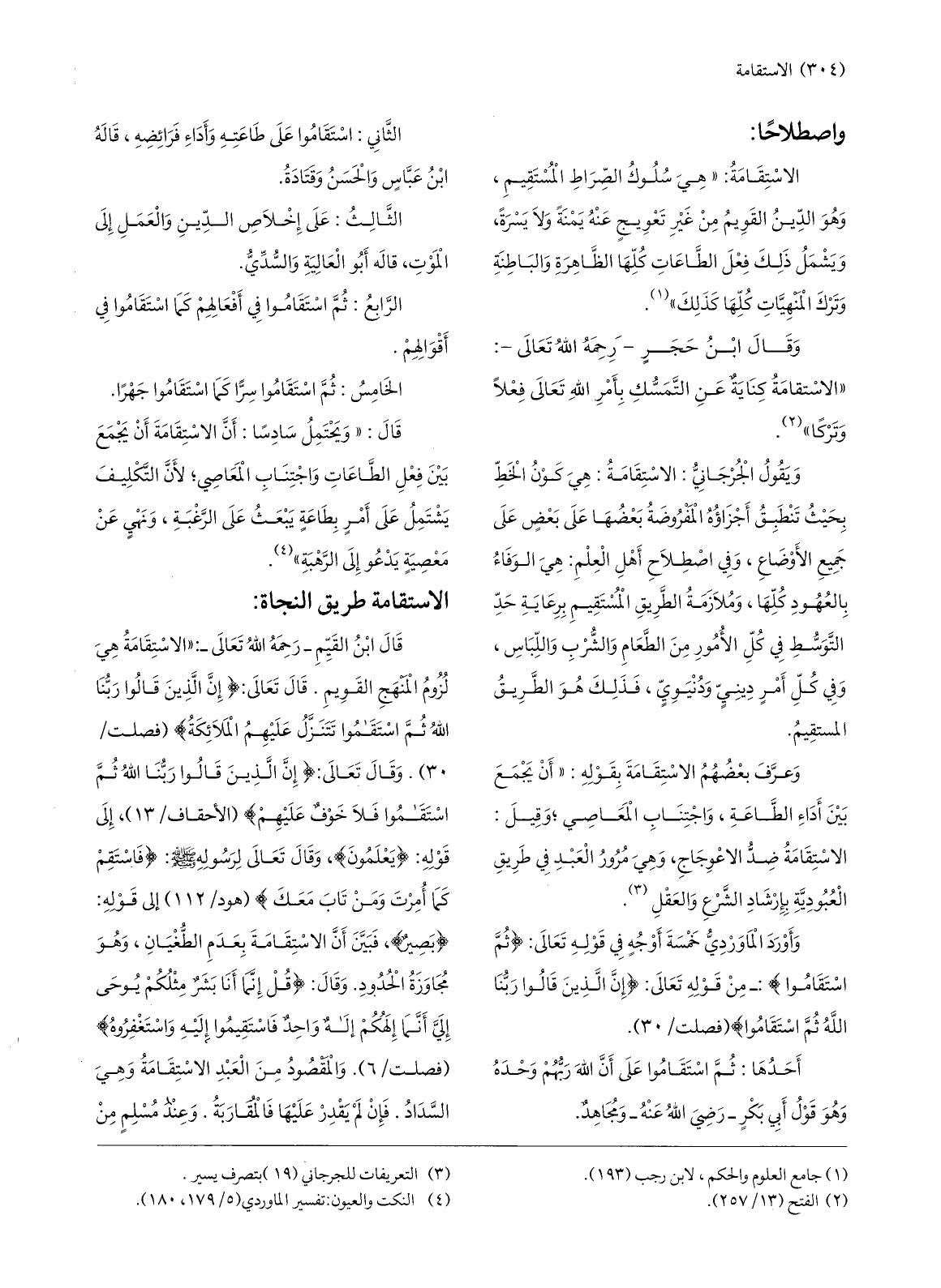 قال ابن القيّم- رحمه الله تعالى-: «الاستقامة هي لزوم المنهج القويم. قال تعالى: إِنَّ الَّذِينَ قالُوا رَبُّنَا اللَّهُ ثُمَّ اسْتَقامُوا تَتَنَزَّلُ عَلَيْهِمُ الْمَلائِكَةُ (فصلت/ 30) . وقال تعالى: إِنَّ الَّذِينَ قالُوا رَبُّنَا اللَّهُ ثُمَّ اسْتَقامُوا فَلا خَوْفٌ عَلَيْهِمْ (الأحقاف/ 13) ، إلى قوله: يَعْمَلُونَ، وقال تعالى لرسوله صلّى الله عليه وسلّم: فَاسْتَقِمْ كَما أُمِرْتَ وَمَنْ تابَ مَعَكَ (هود/ 112) إلى قوله: