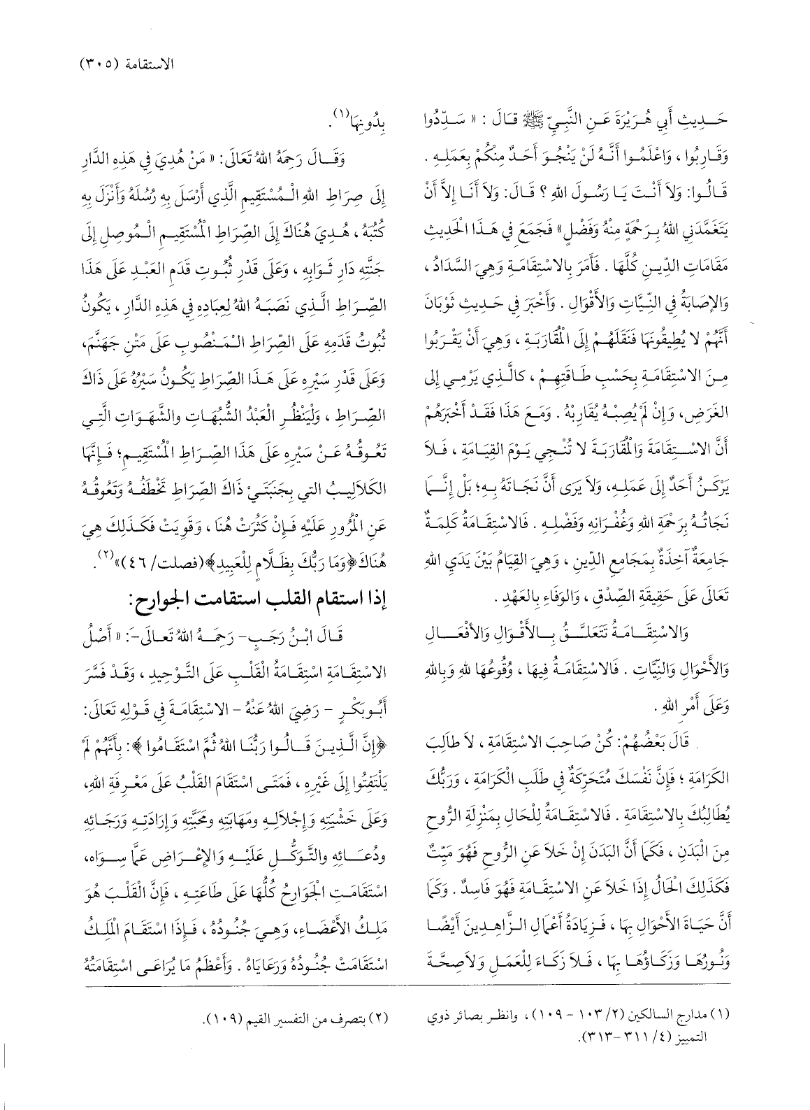 قالوا: ولا أنت يا رسول الله؟ قال: ولا أنا إلّا أن يتغمّدني الله برحمة منه وفضل» فجمع في هذا الحديث مقامات الدّين كلّها. فأمر بالاستقامة وهي السّداد، والإصابة في النّيّات والأقوال. وأخبر في حديث ثوبان أنّهم لا يطيقونها فنقلهم إلى المقاربة، وهي أن يقربوا من الاستقامة بحسب طاقتهم، كالّذي يرمي إلى الغرض، وإن لم يصبه يقاربه. ومع هذا فقد أخبرهم أنّ الاستقامة والمقاربة لا تنجي يوم القيامة، فلا يركن أحد إلى عمله، ولا يرى أنّ نجاته به؛ بل إنّما نجاته برحمة الله وغفرانه وفضله. فالاستقامة كلمة جامعة آخذة بمجامع الدّين، وهي القيام بين يدي الله تعالى على حقيقة الصّدق، والوفاء بالعهد.