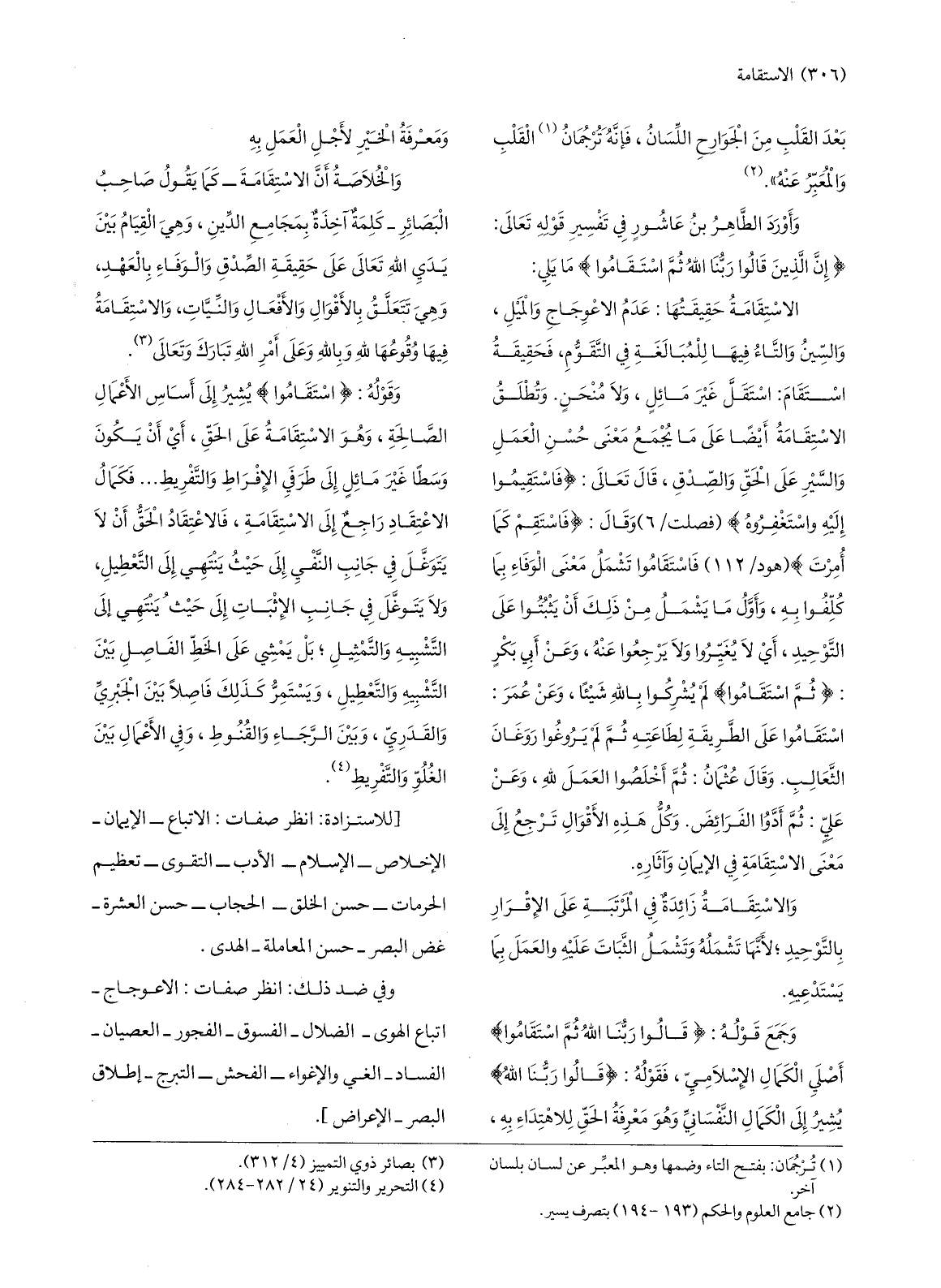 والخلاصة أنّ الاستقامة- كما يقول صاحب البصائر- كلمة آخذة بمجامع الدّين، وهي القيام بين يدي الله تعالى على حقيقة الصّدق والوفاء بالعهد، وهي تتعلّق بالأقوال والأفعال والنّيّات، والاستقامة فيها وقوعها لله وبالله وعلى أمر الله تبارك وتعالى «3» .