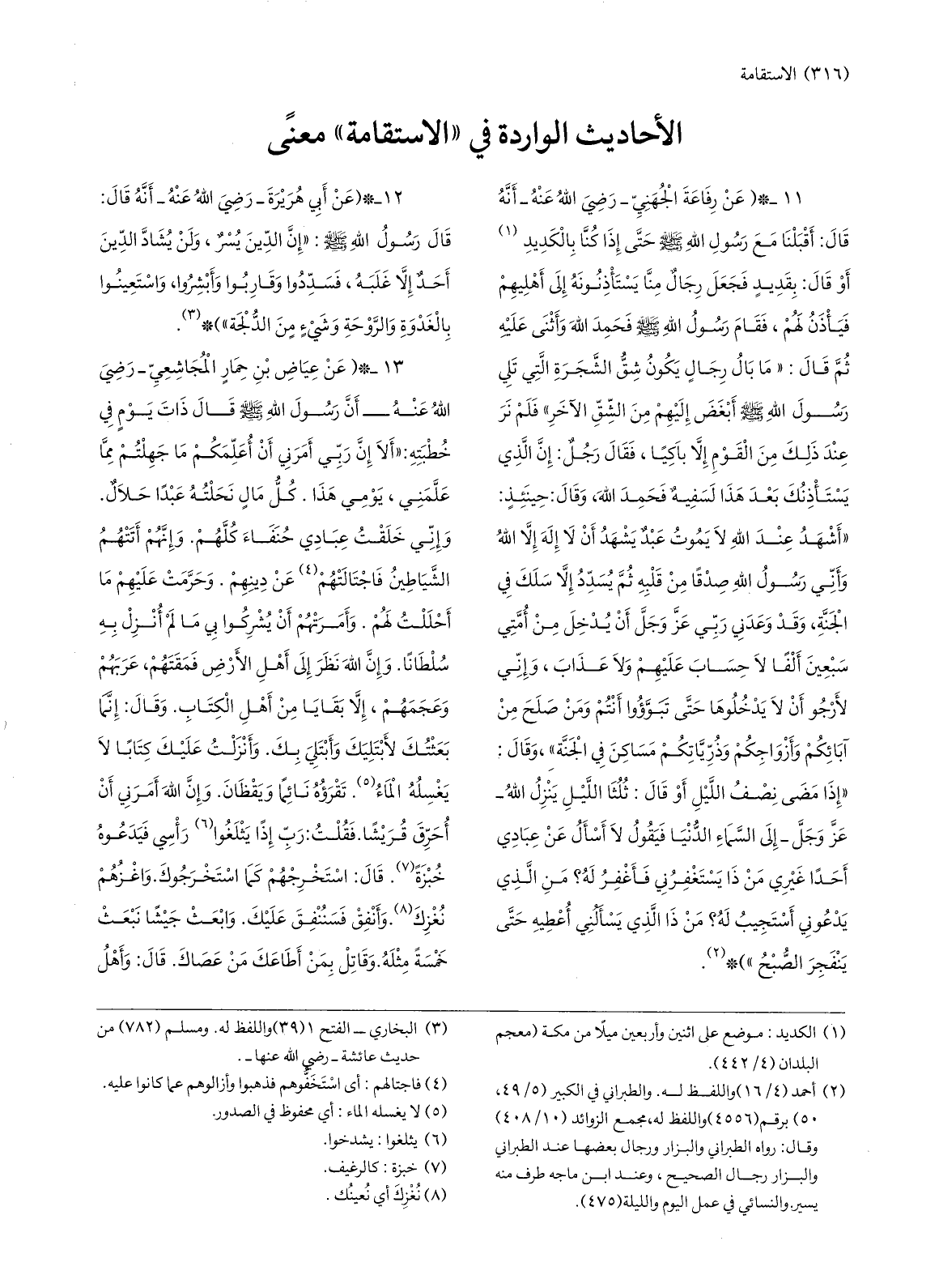 12-* (عن أبي هريرة- رضي الله عنه- أنّه قال: قال رسول الله صلّى الله عليه وسلّم: «إنّ الدّين يسر، ولن يشادّ الدّين أحد إلّا غلبه، فسدّدوا وقاربوا وأبشروا، واستعينوا بالغدوة والرّوحة وشيء من الدّلجة» ) * «3» .