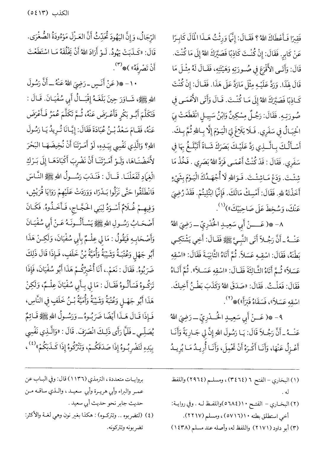 9-* (عن أبي سعيد الخدريّ- رضي الله عنه- أنّ رجلا قال: يا رسول الله إنّ لي جارية وأنا أعزل عنها، وأنا أكره أن تحمل، وأنا أريد ما يريد الرّجال، وإنّ اليهود تحدّث أنّ العزل موءودة الصّغرى.