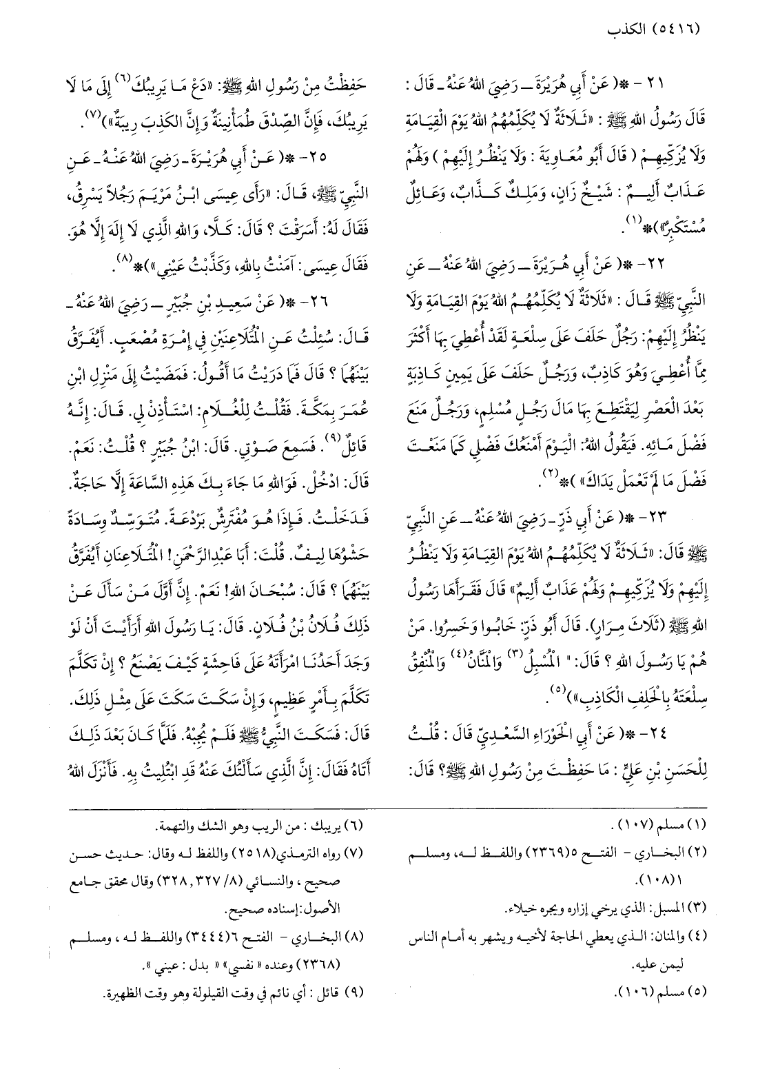 23-* (عن أبي ذرّ- رضي الله عنه- عن النّبيّ صلّى الله عليه وسلّم قال: «ثلاثة لا يكلّمهم الله يوم القيامة ولا ينظر إليهم ولا يزكّيهم ولهم عذاب أليم» قال فقرأها رسول الله صلّى الله عليه وسلّم (ثلاث مرار) . قال أبو ذرّ: خابوا وخسروا. من هم يا رسول الله؟ قال:" المسبل «3» والمنّان «4» والمنفق سلعته بالحلف الكاذب» ) «5» .