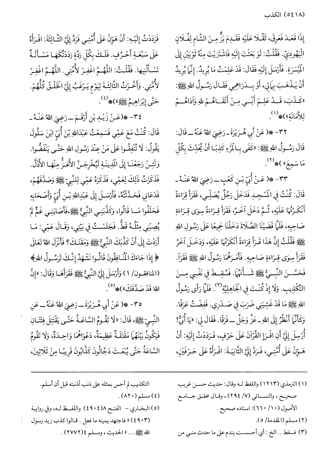 35-* (عن أبي هريرة- رضي الله عنه- عن النّبيّ صلّى الله عليه وسلّم، قال: «لا تقوم السّاعة حتّى يقتتل فئتان فيكون بينهما مقتلة عظيمة، دعواهما واحدة، ولا تقوم السّاعة حتّى يبعث دجّالون كذّابون قريبا من ثلاثين،