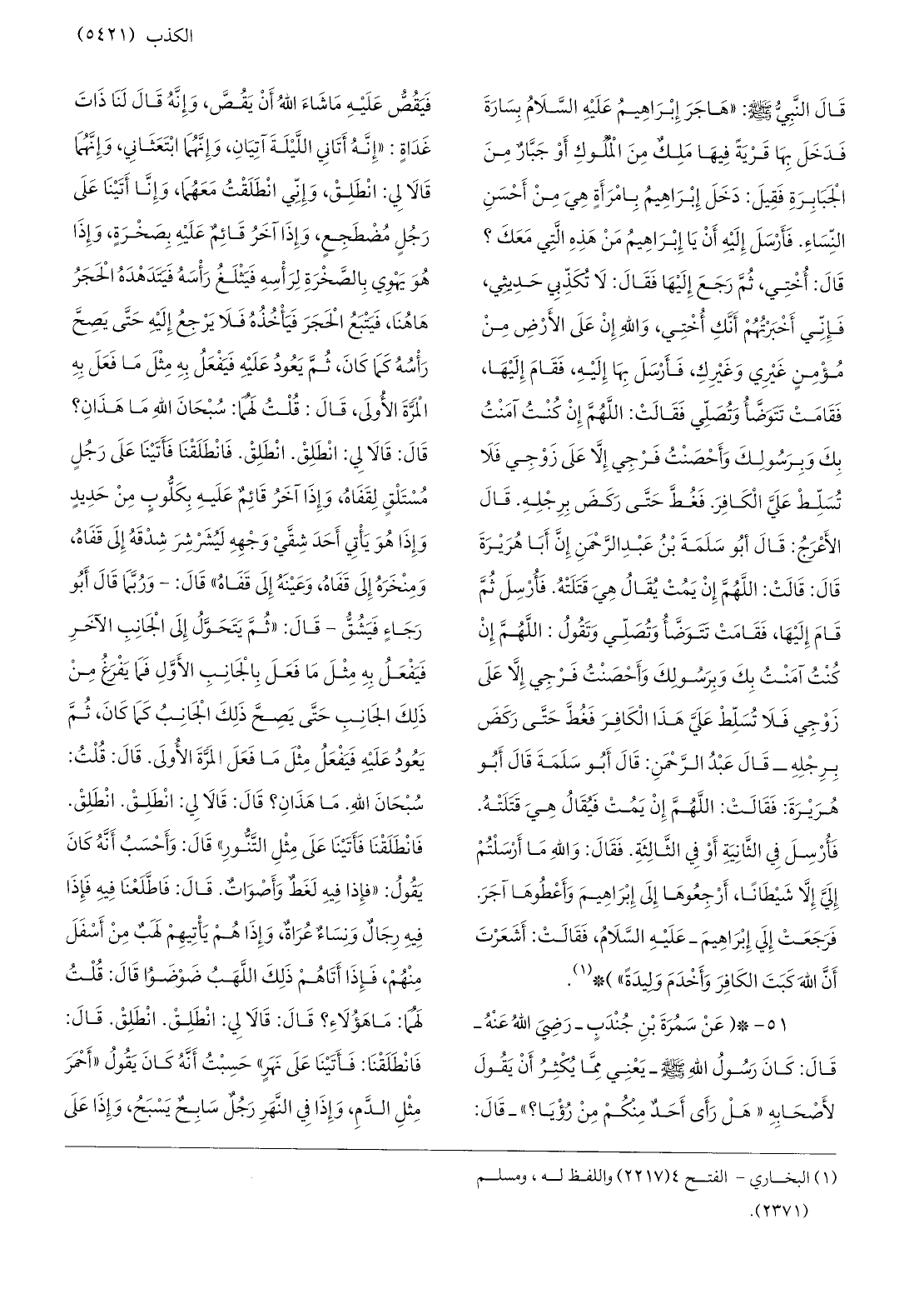 51-* (عن سمرة بن جندب- رضي الله عنه- قال: كان رسول الله صلّى الله عليه وسلّم- يعني ممّا يكثر أن يقول لأصحابه «هل رأى أحد منكم من رؤيا؟» - قال: فيقصّ عليه ما شاء الله أن يقصّ، وإنّه قال لنا ذات غداة: «إنّه أتاني اللّيلة آتيان، وإنّهما ابتعثاني، وإنّهما قالا لي: انطلق، وإنّي انطلقت معهما، وإنّا أتينا على رجل مضطجع، وإذا آخر قائم عليه بصخرة، وإذا هو يهوي بالصّخرة لرأسه فيثلغ رأسه فيتدهده الحجر هاهنا، فيتبع الحجر فيأخذه فلا يرجع إليه حتّى يصحّ رأسه كما كان، ثمّ يعود عليه فيفعل به مثل ما فعل به المرّة الأولى، قال: قلت لهما: سبحان الله ما هذان؟ قال: قالا لي: انطلق. انطلق. فانطلقنا فأتينا على رجل مستلق لقفاه، وإذا آخر قائم عليه بكلّوب من حديد وإذا هو يأتي أحد شقّي وجهه ليشرشر شدقه إلى قفاه، ومنخره إلى قفاه، وعينه إلى قفاه» قال: