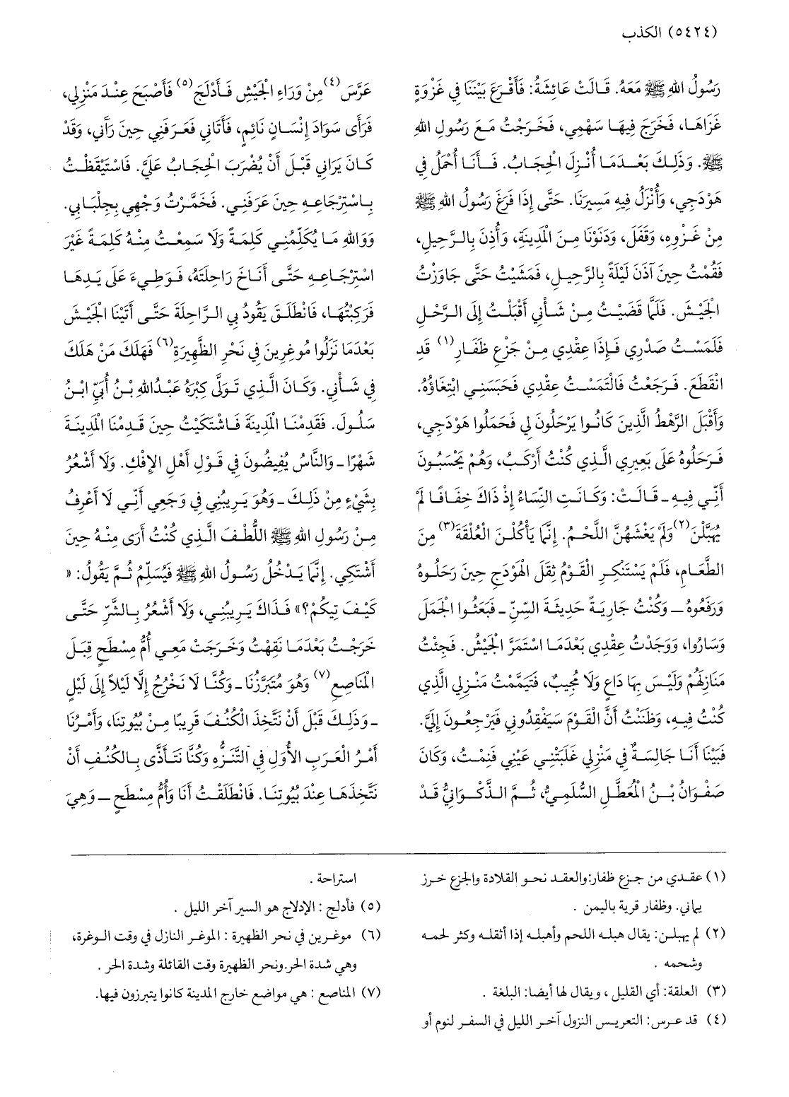 فخمّرت وجهي بجلبابي. وو الله ما يكلّمني كلمة ولا سمعت منه كلمة غير استرجاعه حتّى أناخ راحلته، فوطيء على يدها فركبتها، فانطلق يقود بي الرّاحلة حتّى أتينا الجيش بعد ما نزلوا موغرين في نحر الظّهيرة «6» فهلك من هلك في شأني. وكان الّذي تولّى كبره عبد الله بن أبيّ ابن سلول. فقدمنا المدينة فاشتكيت حين قدمنا المدينة شهرا- والنّاس يفيضون في قول أهل الإفك. ولا أشعر بشيء من ذلك- وهو يريبني في وجعي أنّي لا أعرف من رسول الله صلّى الله عليه وسلّم اللّطف الّذي كنت أرى منه حين أشتكي. إنّما يدخل رسول الله صلّى الله عليه وسلّم فيسلّم ثمّ يقول: «كيف تيكم؟» فذاك يريبني، ولا أشعر بالشّرّ حتّى خرجت بعدما نقهت وخرجت معي أمّ مسطح قبل المناصع «7» وهو متبرّزنا وكنّا لا نخرج إلّا ليلا إلى ليل- وذلك قبل أن نتّخذ الكنف قريبا من بيوتنا، وأمرنا أمر العرب الأول في التّنزّه وكنّا نتأذّى بالكنف أن نتّخذها عند بيوتنا.
