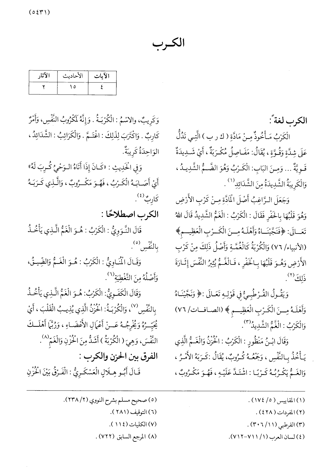 وجعل الرّاغب أصل المادّة من كرب الأرض وهو قلبها بالحفر فقال: الكرب: الغمّ الشّديد قال الله تعالى: فَنَجَّيْناهُ وَأَهْلَهُ مِنَ الْكَرْبِ الْعَظِيمِ (الأنبياء/ 76) والكربة كالغمّة وأصل ذلك من كرب الأرض وهو قلبها بالحفر، فالغّمّ يثير النّفس إثارة ذلك «2» .