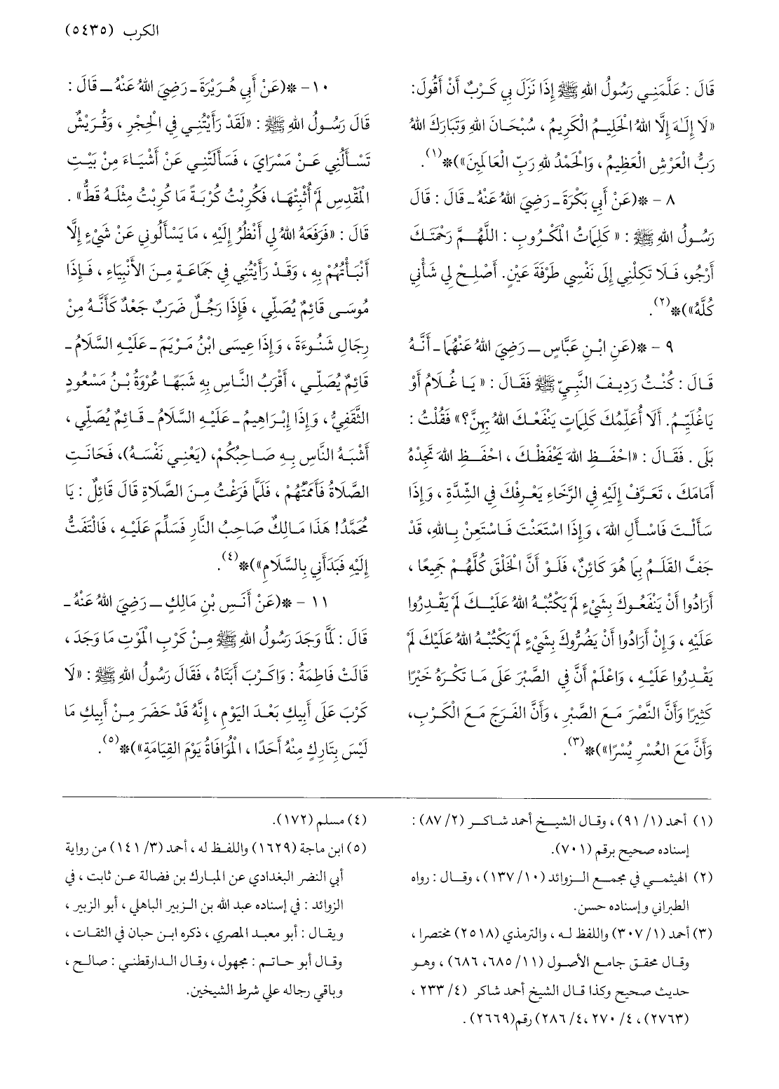قال رسول الله صلّى الله عليه وسلّم: «كلمات المكروب: اللهمّ رحمتك أرجو، فلا تكلني إلى نفسي طرفة عين. أصلح لي شأني كلّه» ) * «2» .