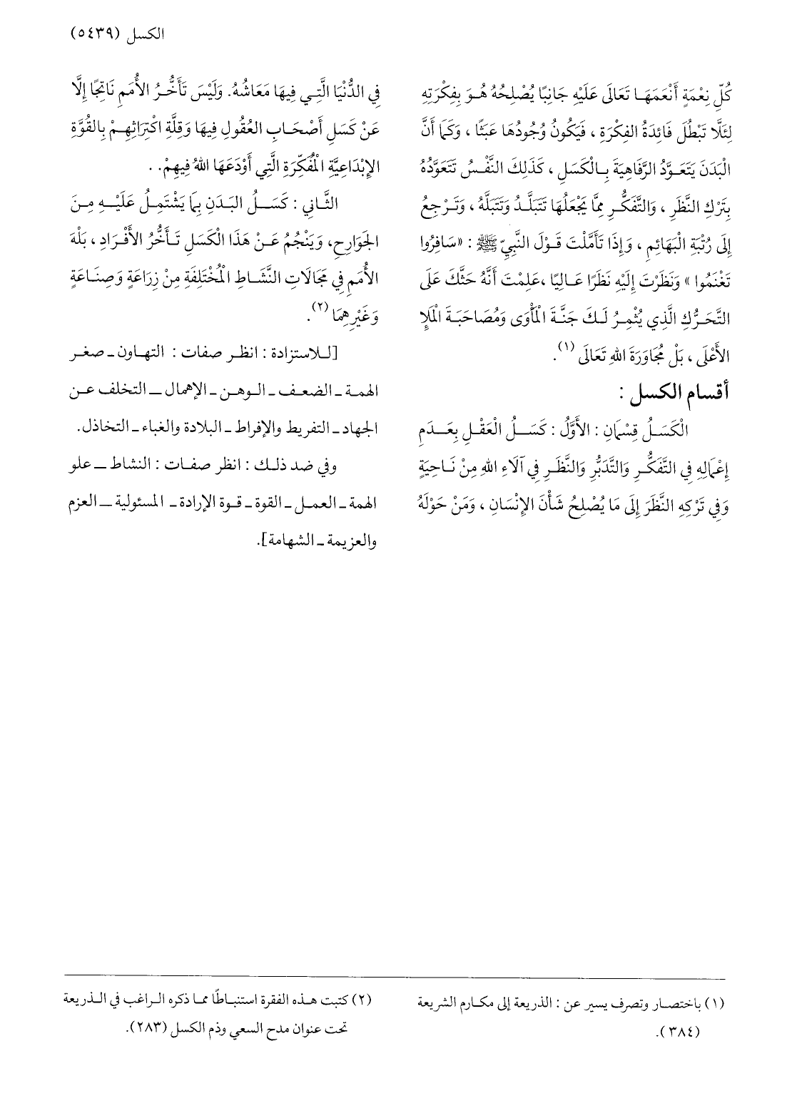 (2) كتبت هذه الفقرة استنباطا مما ذكره الراغب في الذريعة تحت عنوان مدح السعي وذم الكسل (283) .