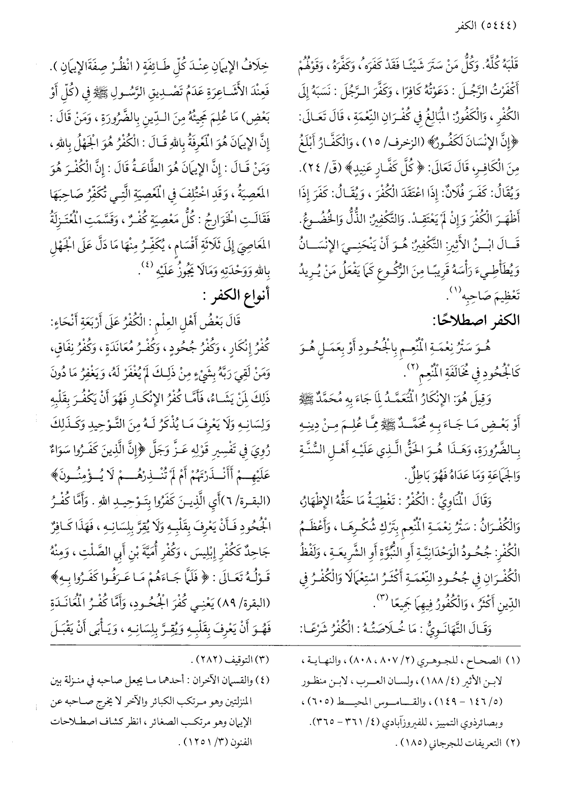 (4) والقسمان الآخران: أحدهما ما يجعل صاحبه في منزلة بين المنزلتين وهو مرتكب الكبائر والآخر لا يخرج صاحبه عن الإيمان وهو مرتكب الصغائر، انظر كشاف اصطلاحات الفنون (3/ 1251) .