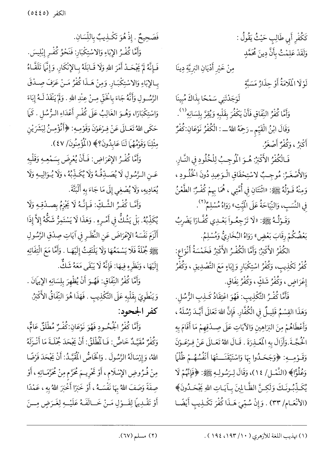 وهذا القسم قليل في الكفّار. فإنّ الله تعالى أيّد رسله، وأعطاهم من البراهين والآيات على صدقهم ما أقام به الحجّة. وأزال به المعذرة. قال الله تعالى عن فرعون وقومه: وَجَحَدُوا بِها وَاسْتَيْقَنَتْها أَنْفُسُهُمْ ظُلْماً وَعُلُوًّا (النّمل/ 14) ، وقال لرسوله صلّى الله عليه وسلّم: فَإِنَّهُمْ لا يُكَذِّبُونَكَ وَلكِنَّ الظَّالِمِينَ بِآياتِ اللَّهِ يَجْحَدُونَ (الأنعام/ 33) . وإن سمّي هذا كفر تكذيب أيضا فصحيح. إذ هو تكذيب باللّسان.