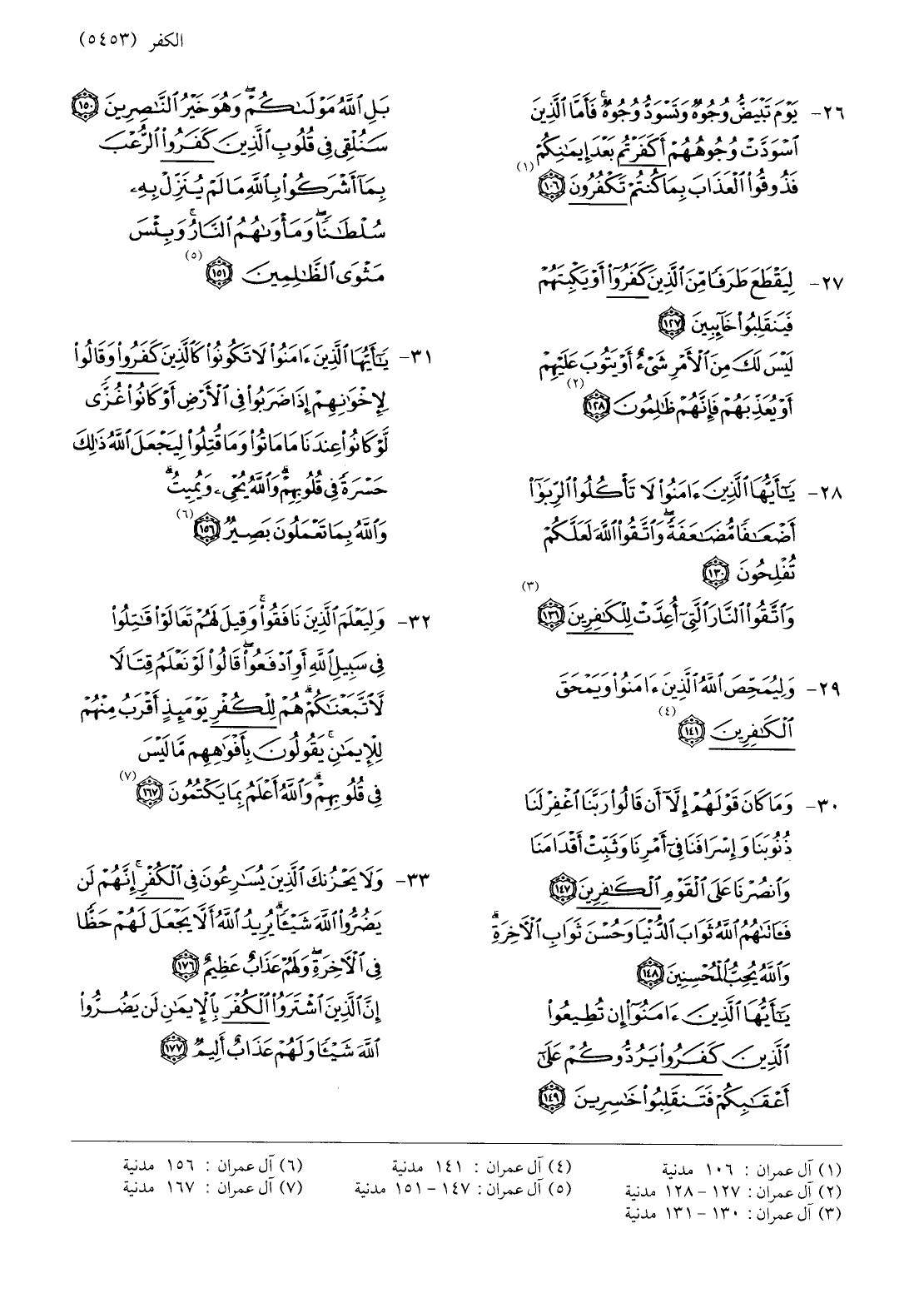 30- وَما كانَ قَوْلَهُمْ إِلَّا أَنْ قالُوا رَبَّنَا اغْفِرْ لَنا ذُنُوبَنا وَإِسْرافَنا فِي أَمْرِنا وَثَبِّتْ أَقْدامَنا وَانْصُرْنا عَلَى الْقَوْمِ الْكافِرِينَ (147) فَآتاهُمُ اللَّهُ ثَوابَ الدُّنْيا وَحُسْنَ ثَوابِ الْآخِرَةِ وَاللَّهُ يُحِبُّ الْمُحْسِنِينَ (148) يا أَيُّهَا الَّذِينَ آمَنُوا إِنْ تُطِيعُوا الَّذِينَ كَفَرُوا يَرُدُّوكُمْ عَلى أَعْقابِكُمْ فَتَنْقَلِبُوا خاسِرِينَ (149) بَلِ اللَّهُ مَوْلاكُمْ وَهُوَ خَيْرُ النَّاصِرِينَ (150) سَنُلْقِي فِي قُلُوبِ الَّذِينَ كَفَرُوا الرُّعْبَ بِما أَشْرَكُوا بِاللَّهِ ما لَمْ يُنَزِّلْ بِهِ سُلْطاناً وَمَأْواهُمُ النَّارُ وَبِئْسَ مَثْوَى الظَّالِمِينَ (151) «5»