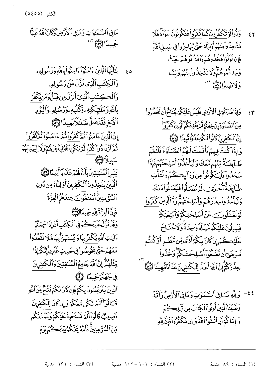 45- يا أَيُّهَا الَّذِينَ آمَنُوا آمِنُوا بِاللَّهِ وَرَسُولِهِ وَالْكِتابِ الَّذِي نَزَّلَ عَلى رَسُولِهِ وَالْكِتابِ الَّذِي أَنْزَلَ مِنْ قَبْلُ وَمَنْ يَكْفُرْ بِاللَّهِ وَمَلائِكَتِهِ وَكُتُبِهِ وَرُسُلِهِ وَالْيَوْمِ الْآخِرِ فَقَدْ ضَلَّ ضَلالًا بَعِيداً (136) إِنَّ الَّذِينَ آمَنُوا ثُمَّ كَفَرُوا ثُمَّ آمَنُوا ثُمَّ كَفَرُوا ثُمَّ ازْدادُوا كُفْراً لَمْ يَكُنِ اللَّهُ لِيَغْفِرَ لَهُمْ وَلا لِيَهْدِيَهُمْ سَبِيلًا (137) بَشِّرِ الْمُنافِقِينَ بِأَنَّ لَهُمْ عَذاباً أَلِيماً (138) الَّذِينَ يَتَّخِذُونَ الْكافِرِينَ أَوْلِياءَ مِنْ دُونِ الْمُؤْمِنِينَ أَيَبْتَغُونَ عِنْدَهُمُ الْعِزَّةَ فَإِنَّ الْعِزَّةَ لِلَّهِ جَمِيعاً (139) وَقَدْ نَزَّلَ عَلَيْكُمْ فِي الْكِتابِ أَنْ إِذا سَمِعْتُمْ آياتِ اللَّهِ يُكْفَرُ بِها وَيُسْتَهْزَأُ بِها فَلا تَقْعُدُوا مَعَهُمْ حَتَّى يَخُوضُوا فِي حَدِيثٍ غَيْرِهِ إِنَّكُمْ إِذاً مِثْلُهُمْ إِنَّ اللَّهَ جامِعُ الْمُنافِقِينَ وَالْكافِرِينَ فِي جَهَنَّمَ جَمِيعاً (140) الَّذِينَ يَتَرَبَّصُونَ بِكُمْ فَإِنْ كانَ لَكُمْ فَتْحٌ مِنَ اللَّهِ قالُوا أَلَمْ نَكُنْ مَعَكُمْ وَإِنْ كانَ لِلْكافِرِينَ نَصِيبٌ قالُوا أَلَمْ نَسْتَحْوِذْ عَلَيْكُمْ وَنَمْنَعْكُمْ مِنَ الْمُؤْمِنِينَ فَاللَّهُ يَحْكُمُ بَيْنَكُمْ يَوْمَ الْقِيامَةِ وَلَنْ يَجْعَلَ اللَّهُ
