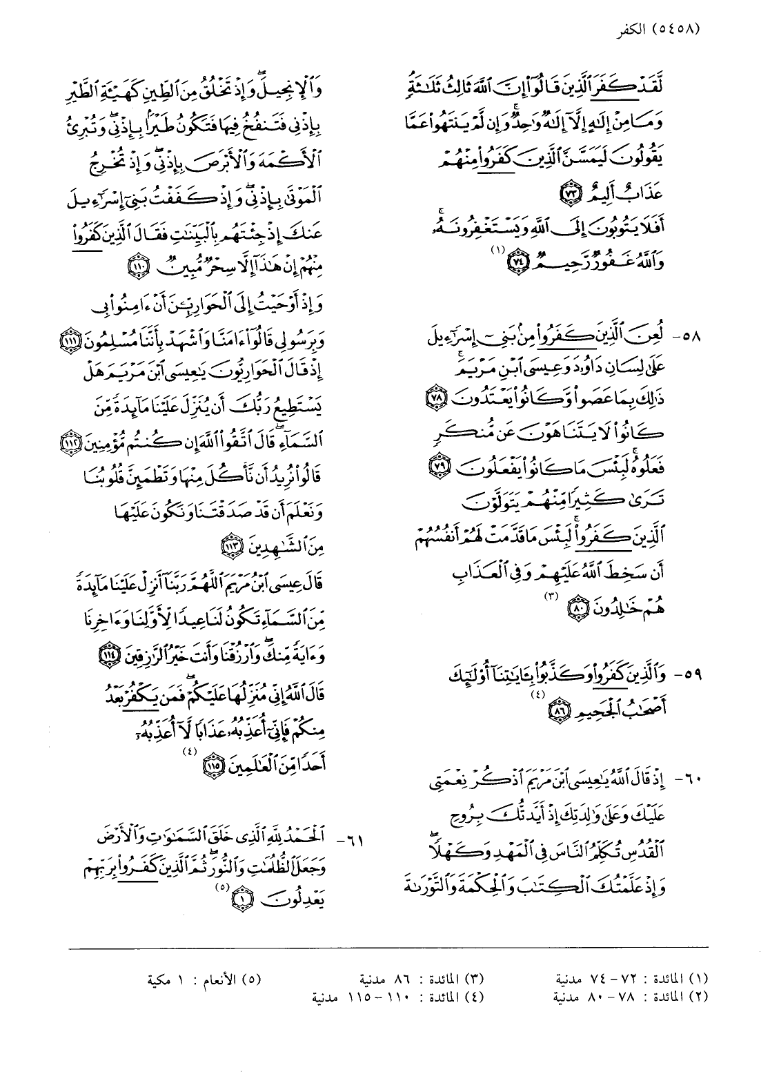 60- إِذْ قالَ اللَّهُ يا عِيسَى ابْنَ مَرْيَمَ اذْكُرْ نِعْمَتِي عَلَيْكَ وَعَلى والِدَتِكَ إِذْ أَيَّدْتُكَ بِرُوحِ الْقُدُسِ تُكَلِّمُ النَّاسَ فِي الْمَهْدِ وَكَهْلًا وَإِذْ عَلَّمْتُكَ الْكِتابَ وَالْحِكْمَةَ وَالتَّوْراةَ وَالْإِنْجِيلَ وَإِذْ تَخْلُقُ مِنَ الطِّينِ كَهَيْئَةِ الطَّيْرِ بِإِذْنِي فَتَنْفُخُ فِيها فَتَكُونُ طَيْراً بِإِذْنِي وَتُبْرِئُ الْأَكْمَهَ وَالْأَبْرَصَ بِإِذْنِي وَإِذْ تُخْرِجُ الْمَوْتى بِإِذْنِي وَإِذْ كَفَفْتُ بَنِي إِسْرائِيلَ عَنْكَ إِذْ جِئْتَهُمْ بِالْبَيِّناتِ فَقالَ الَّذِينَ كَفَرُوا مِنْهُمْ إِنْ هذا إِلَّا سِحْرٌ مُبِينٌ (110) وَإِذْ أَوْحَيْتُ إِلَى الْحَوارِيِّينَ أَنْ آمِنُوا بِي وَبِرَسُولِي قالُوا آمَنَّا وَاشْهَدْ بِأَنَّنا مُسْلِمُونَ (111) إِذْ قالَ الْحَوارِيُّونَ يا عِيسَى ابْنَ مَرْيَمَ هَلْ يَسْتَطِيعُ رَبُّكَ أَنْ يُنَزِّلَ عَلَيْنا مائِدَةً مِنَ السَّماءِ قالَ اتَّقُوا اللَّهَ إِنْ كُنْتُمْ مُؤْمِنِينَ (112) قالُوا نُرِيدُ أَنْ نَأْكُلَ مِنْها وَتَطْمَئِنَّ قُلُوبُنا وَنَعْلَمَ أَنْ قَدْ صَدَقْتَنا وَنَكُونَ عَلَيْها مِنَ الشَّاهِدِينَ (13) قالَ عِيسَى ابْنُ مَرْيَمَ اللَّهُمَّ رَبَّنا أَنْزِلْ عَلَيْنا مائِدَةً مِنَ السَّماءِ تَكُونُ لَنا عِيداً لِأَوَّلِنا وَآخِرِنا وَآيَةً مِنْكَ وَارْزُقْنا وَأَنْتَ خَيْرُ الرَّازِقِينَ (114) قالَ اللَّهُ إِنِّي مُنَزِّلُها عَلَيْكُمْ فَمَنْ يَكْفُرْ بَعْدُ مِنْكُمْ فَإِنِّي أُعَذِّبُهُ عَذاباً لا أُعَذِّبُهُ أَحَداً مِنَ الْعالَمِينَ (115) «4»