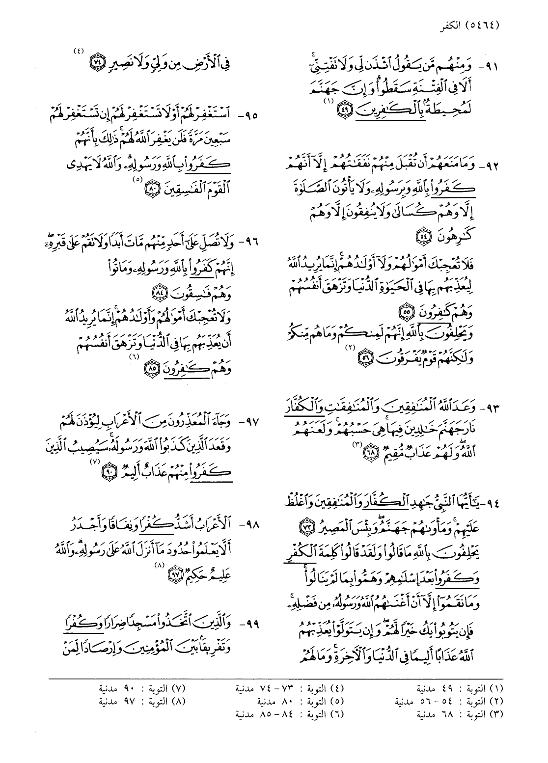 92- وَما مَنَعَهُمْ أَنْ تُقْبَلَ مِنْهُمْ نَفَقاتُهُمْ إِلَّا أَنَّهُمْ كَفَرُوا بِاللَّهِ وَبِرَسُولِهِ وَلا يَأْتُونَ الصَّلاةَ إِلَّا وَهُمْ كُسالى وَلا يُنْفِقُونَ إِلَّا وَهُمْ كارِهُونَ (54) فَلا تُعْجِبْكَ أَمْوالُهُمْ وَلا أَوْلادُهُمْ إِنَّما يُرِيدُ اللَّهُ لِيُعَذِّبَهُمْ بِها فِي الْحَياةِ الدُّنْيا وَتَزْهَقَ أَنْفُسُهُمْ وَهُمْ كافِرُونَ (55) وَيَحْلِفُونَ بِاللَّهِ إِنَّهُمْ لَمِنْكُمْ وَما هُمْ مِنْكُمْ وَلكِنَّهُمْ قَوْمٌ يَفْرَقُونَ (56) «2»