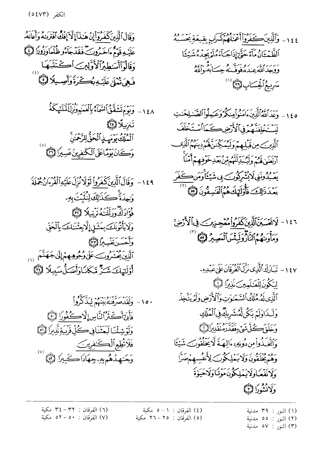 147- تَبارَكَ الَّذِي نَزَّلَ الْفُرْقانَ عَلى عَبْدِهِ لِيَكُونَ لِلْعالَمِينَ نَذِيراً (1) الَّذِي لَهُ مُلْكُ السَّماواتِ وَالْأَرْضِ وَلَمْ يَتَّخِذْ وَلَداً وَلَمْ يَكُنْ لَهُ شَرِيكٌ فِي الْمُلْكِ وَخَلَقَ كُلَّ شَيْءٍ فَقَدَّرَهُ تَقْدِيراً (2) وَاتَّخَذُوا مِنْ دُونِهِ آلِهَةً لا يَخْلُقُونَ شَيْئاً وَهُمْ يُخْلَقُونَ وَلا يَمْلِكُونَ لِأَنْفُسِهِمْ ضَرًّا وَلا نَفْعاً وَلا يَمْلِكُونَ مَوْتاً وَلا حَياةً وَلا نُشُوراً (3) وَقالَ الَّذِينَ كَفَرُوا إِنْ هَذا إِلَّا إِفْكٌ افْتَراهُ وَأَعانَهُ عَلَيْهِ قَوْمٌ آخَرُونَ فَقَدْ جاؤُ ظُلْماً وَزُوراً (4) وَقالُوا أَساطِيرُ الْأَوَّلِينَ اكْتَتَبَها فَهِيَ تُمْلى عَلَيْهِ بُكْرَةً وَأَصِيلًا (5) «4»
