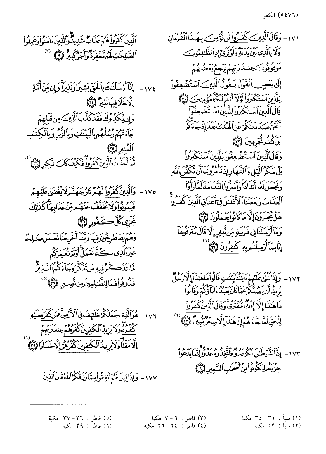 171- وَقالَ الَّذِينَ كَفَرُوا لَنْ نُؤْمِنَ بِهذَا الْقُرْآنِ وَلا بِالَّذِي بَيْنَ يَدَيْهِ وَلَوْ تَرى إِذِ الظَّالِمُونَ مَوْقُوفُونَ عِنْدَ رَبِّهِمْ يَرْجِعُ بَعْضُهُمْ إِلى بَعْضٍ الْقَوْلَ يَقُولُ الَّذِينَ اسْتُضْعِفُوا لِلَّذِينَ اسْتَكْبَرُوا لَوْلا أَنْتُمْ لَكُنَّا مُؤْمِنِينَ (31) قالَ الَّذِينَ اسْتَكْبَرُوا لِلَّذِينَ اسْتُضْعِفُوا أَنَحْنُ صَدَدْناكُمْ عَنِ الْهُدى بَعْدَ إِذْ جاءَكُمْ بَلْ كُنْتُمْ مُجْرِمِينَ (32) وَقالَ الَّذِينَ اسْتُضْعِفُوا لِلَّذِينَ اسْتَكْبَرُوا بَلْ مَكْرُ اللَّيْلِ وَالنَّهارِ إِذْ تَأْمُرُونَنا أَنْ نَكْفُرَ بِاللَّهِ وَنَجْعَلَ لَهُ أَنْداداً وَأَسَرُّوا النَّدامَةَ لَمَّا رَأَوُا الْعَذابَ وَجَعَلْنَا الْأَغْلالَ فِي أَعْناقِ الَّذِينَ كَفَرُوا هَلْ يُجْزَوْنَ إِلَّا ما كانُوا يَعْمَلُونَ (33) وَما أَرْسَلْنا فِي قَرْيَةٍ مِنْ نَذِيرٍ إِلَّا قالَ مُتْرَفُوها إِنَّا بِما أُرْسِلْتُمْ بِهِ كافِرُونَ (34) «1»