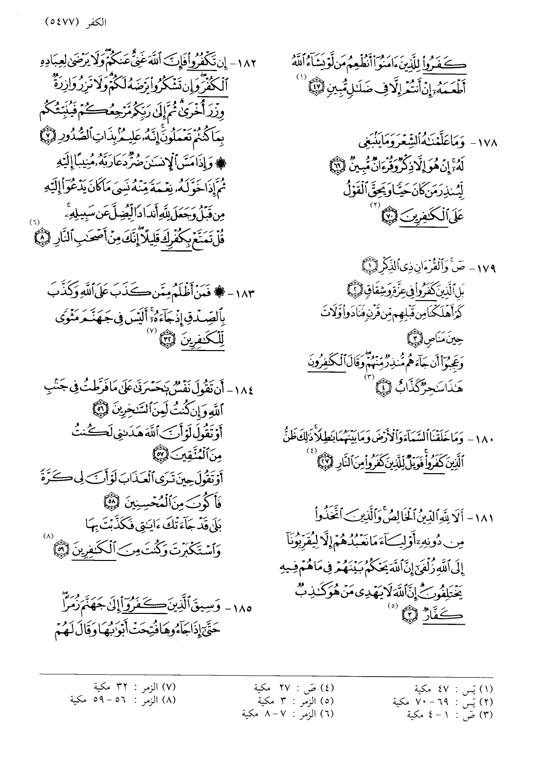 179- ص وَالْقُرْآنِ ذِي الذِّكْرِ (1) بَلِ الَّذِينَ كَفَرُوا فِي عِزَّةٍ وَشِقاقٍ (2) كَمْ أَهْلَكْنا مِنْ قَبْلِهِمْ مِنْ قَرْنٍ فَنادَوْا وَلاتَ حِينَ مَناصٍ (3) وَعَجِبُوا أَنْ جاءَهُمْ مُنْذِرٌ مِنْهُمْ وَقالَ الْكافِرُونَ هذا ساحِرٌ كَذَّابٌ (4) «3»