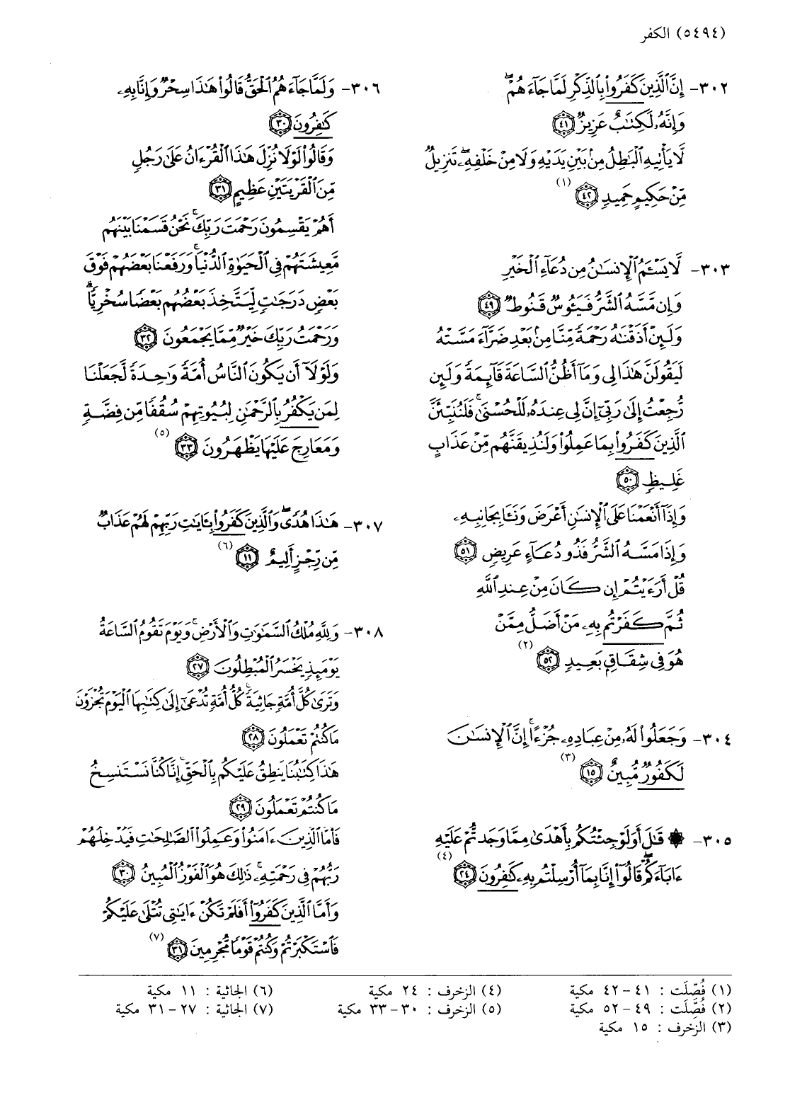 306- وَلَمَّا جاءَهُمُ الْحَقُّ قالُوا هذا سِحْرٌ وَإِنَّا بِهِ كافِرُونَ (30) وَقالُوا لَوْلا نُزِّلَ هذَا الْقُرْآنُ عَلى رَجُلٍ مِنَ الْقَرْيَتَيْنِ عَظِيمٍ (31) أَهُمْ يَقْسِمُونَ رَحْمَتَ رَبِّكَ نَحْنُ قَسَمْنا بَيْنَهُمْ مَعِيشَتَهُمْ فِي الْحَياةِ الدُّنْيا وَرَفَعْنا بَعْضَهُمْ فَوْقَ بَعْضٍ دَرَجاتٍ لِيَتَّخِذَ بَعْضُهُمْ بَعْضاً سُخْرِيًّا وَرَحْمَتُ رَبِّكَ خَيْرٌ مِمَّا يَجْمَعُونَ (32) وَلَوْلا أَنْ يَكُونَ النَّاسُ أُمَّةً واحِدَةً لَجَعَلْنا لِمَنْ يَكْفُرُ بِالرَّحْمنِ لِبُيُوتِهِمْ سُقُفاً مِنْ فِضَّةٍ وَمَعارِجَ عَلَيْها يَظْهَرُونَ (33) «5»