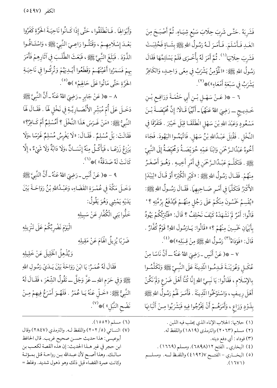 8-* (عن جابر- رضي الله عنه- أنّ النّبيّ صلّى الله عليه وسلّم دخل على أمّ مبشّر الأنصاريّة في نخل لها. فقال لها النّبيّ صلّى الله عليه وسلّم: «من غرس هذا النّخل؟ أمسلم أم كافر؟» فقالت: بل مسلم. فقال: «لا يغرس مسلم غرسا، ولا يزرع زرعا، فيأكل منه إنسان، ولا دابّة ولا شيء، إلّا كانت له صدقة» ) * «6» .