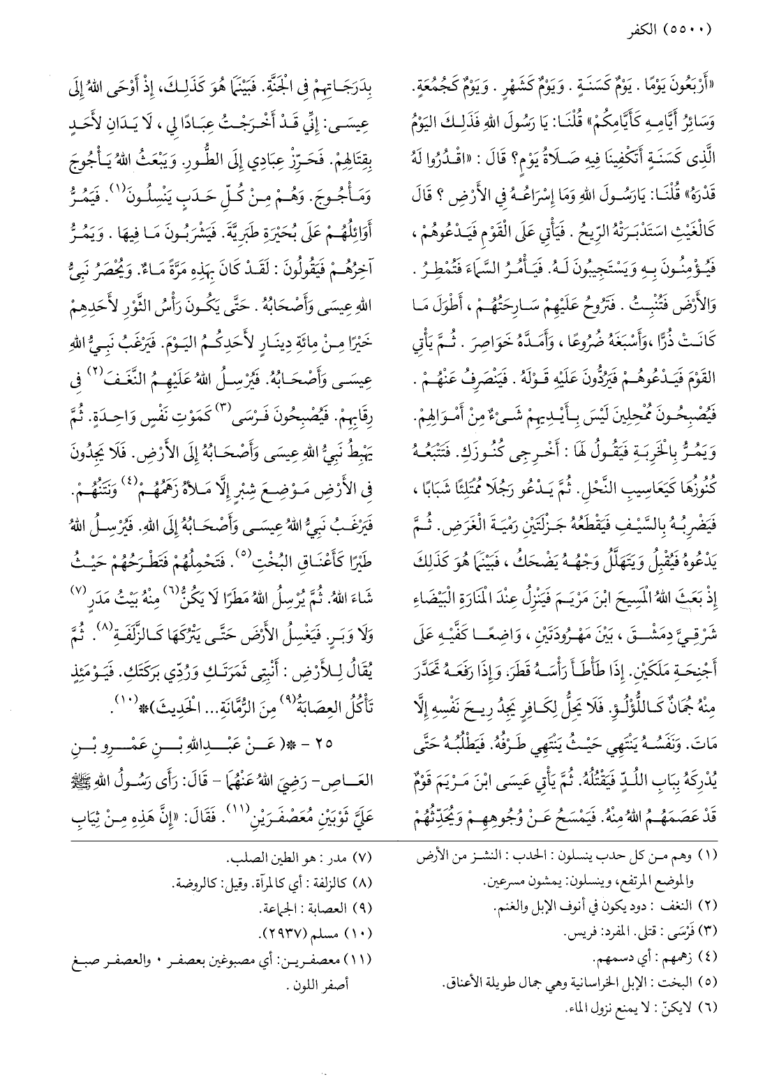 ويمرّ بالخربة فيقول لها: أخرجى كنوزك. فتتبعه كنوزها كيعاسيب النّحل. ثمّ يدعو رجلا ممتلئا شبابا، فيضربه بالسّيف فيقطعه جزلتين رمية الغرض. ثمّ يدعوه فيقبل ويتهلّل وجهه يضحك، فبينما هو كذلك إذ بعث الله المسيح ابن مريم فينزل عند المنارة البيضاء شرقيّ دمشق، بين مهرودتين، واضعا كفّيه على أجنحة ملكين. إذا طأطأ رأسه قطر. وإذا رفعه تحدّر منه جمان كاللّؤلؤ. فلا يحلّ لكافر يجد ريح نفسه إلّا مات. ونفسه ينتهي حيث ينتهي طرفه. فيطلبه حتّى يدركه بباب اللدّ فيقتله. ثمّ يأتي عيسى ابن مريم قوم قد عصمهم الله منه. فيمسح عن وجوههم ويحدّثهم بدرجاتهم في الجنّة. فبينما هو كذلك، إذ أوحى الله إلى عيسى: إنّي قد أخرجت عبادا لى، لا يدان لأحد بقتالهم. فحرّز عبادي إلى الطّور. ويبعث الله يأجوج ومأجوج. وهم من كلّ حدب ينسلون «1» . فيمرّ أوائلهم على بحيرة طبريّة. فيشربون ما فيها. ويمرّ آخرهم فيقولون: لقد كان بهذه مرّة ماء. ويحصر نبيّ الله عيسى وأصحابه. حتّى يكون رأس الثّور لأحدهم خيرا من مائة دينار لأحدكم اليوم. فيرغب نبيّ الله عيسى وأصحابه. فيرسل الله عليهم النّغف «2» في رقابهم. فيصبحون فرسى «3» كموت نفس واحدة. ثمّ يهبط نبيّ الله عيسى وأصحابه إلى الأرض. فلا يجدون في الأرض موضع شبر إلّا ملأه زهمهم «4» ونتنهم.