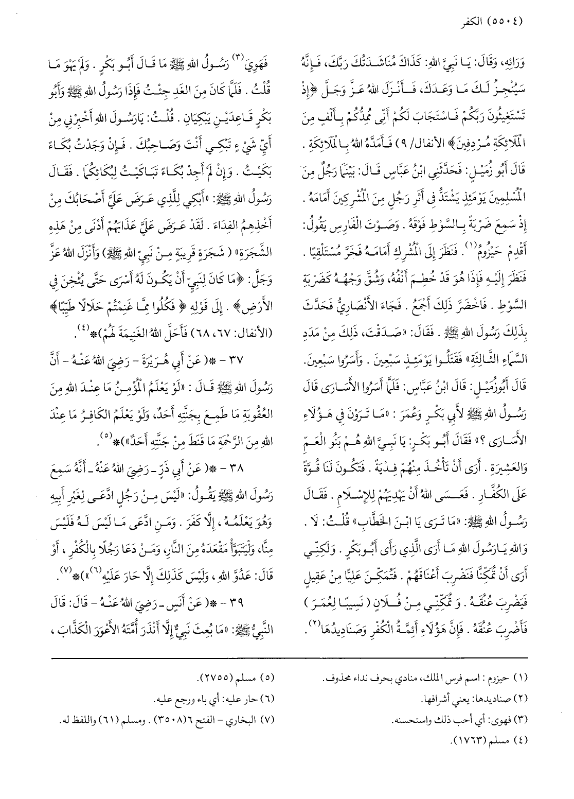 38-* (عن أبي ذرّ- رضي الله عنه- أنّه سمع رسول الله صلّى الله عليه وسلّم يقول: «ليس من رجل ادّعى لغير أبيه وهو يعلمه، إلّا كفر. ومن ادّعى ما ليس له فليس منّا، وليتبوّأ مقعده من النّار، ومن دعا رجلا بالكفر، أو قال: عدوّ الله، وليس كذلك إلّا حار عليه «6» » ) * «7» .