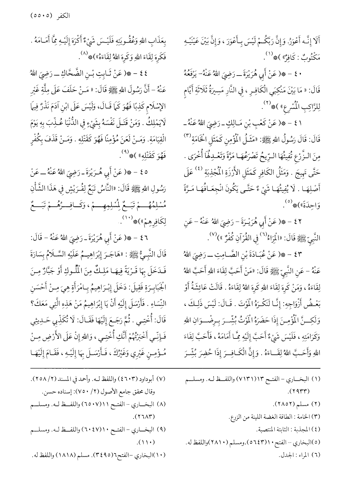 43-* (عن عبادة بن الصّامت- رضي الله عنه- عن النّبيّ صلّى الله عليه وسلّم قال: «من أحبّ لقاء الله أحبّ الله لقاءه، ومن كره لقاء الله كره الله لقاءه. قالت عائشة أو بعض أزواجه: إنّا لنكره الموت. قال: ليس ذلك، ولكنّ المؤمن إذا حضره الموت بشّر برضوان الله وكرامته، فليس شيء أحبّ إليه ممّا أمامه، فأحبّ لقاء الله وأحبّ الله لقاءه. وإنّ الكافر إذا حضر بشّر بعذاب الله وعقوبته فليس شيء أكره إليه ممّا أمامه.