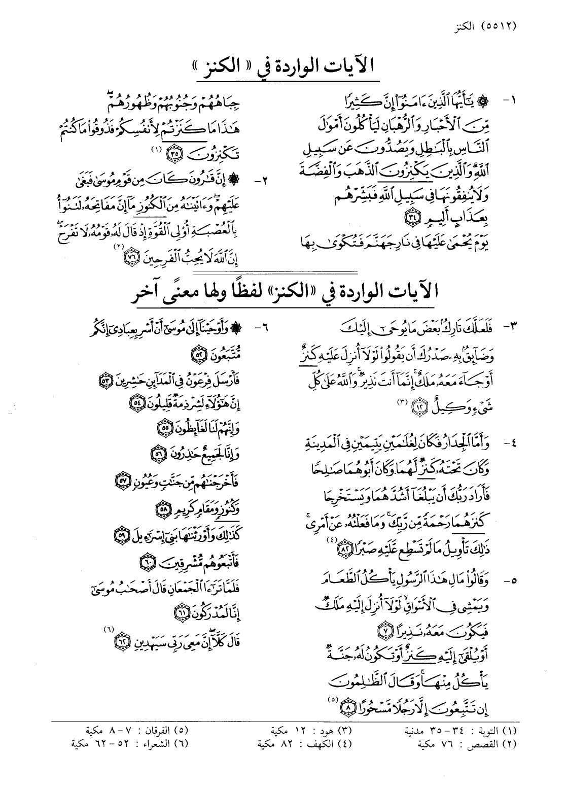 الآيات الواردة في «الكنز» لفظا ولها معنى آخر