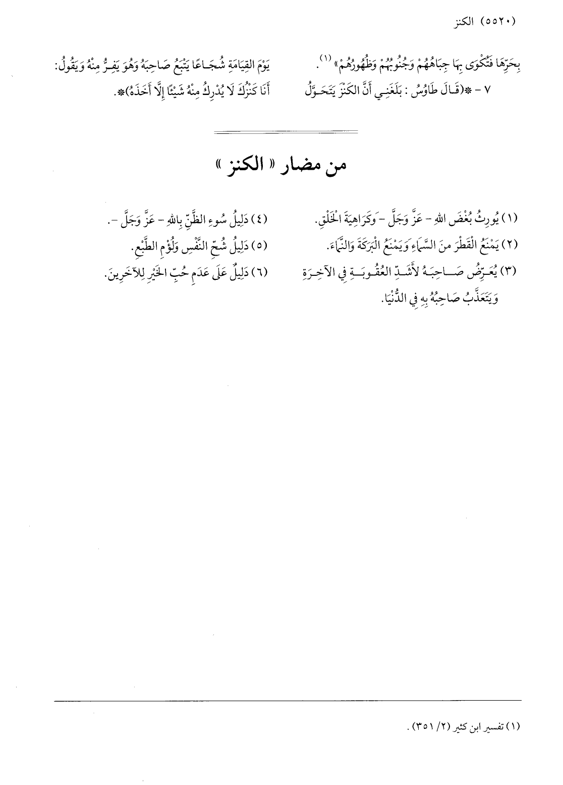 7-* (قال طاوس: بلغني أنّ الكنز يتحوّل يوم القيامة شجاعا يتبع صاحبه وهو يفرّ منه ويقول: