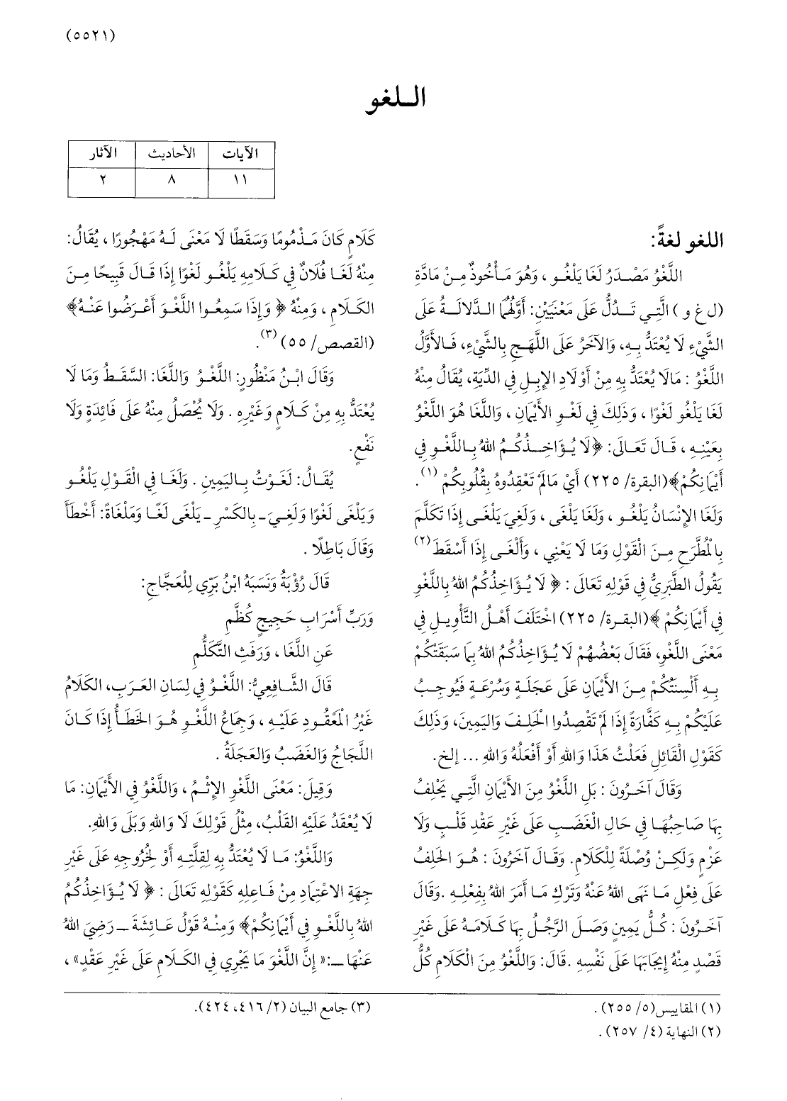 ولغا الإنسان يلغو، ولغا يلغى، ولغي يلغى إذا تكلّم بالمطّرح من القول وما لا يعني، وألغى إذا أسقط «2» يقول الطّبريّ في قوله تعالى: لا يُؤاخِذُكُمُ اللَّهُ بِاللَّغْوِ فِي أَيْمانِكُمْ (البقرة/ 225) اختلف أهل التّأويل في معنى اللّغو، فقال بعضهم لا يؤاخذكم الله بما سبقتكم به ألسنتكم من الأيمان على عجلة وسرعة فيوجب عليكم به كفّارة إذا لم تقصدوا الحلف واليمين، وذلك كقول القائل فعلت هذا والله أو أفعله والله ... إلخ.