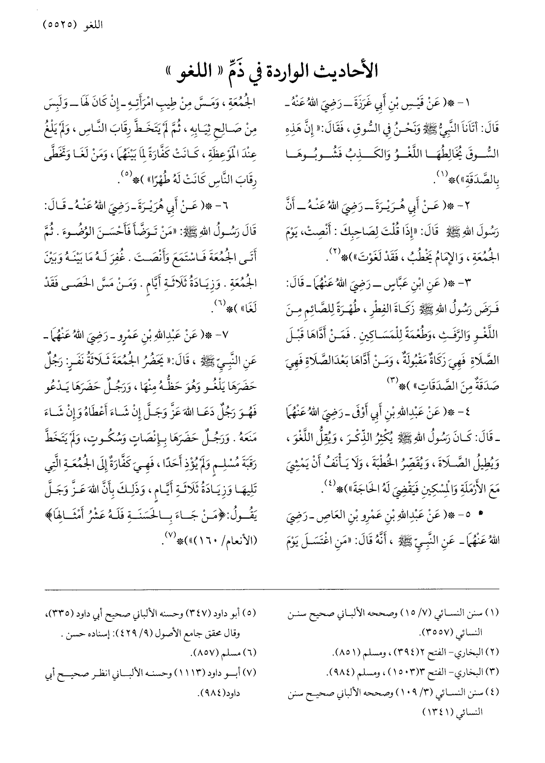 2-* (عن أبي هريرة- رضي الله عنه- أنّ رسول الله صلّى الله عليه وسلّم قال: «إذا قلت لصاحبك: أنصت، يوم الجمعة، والإمام يخطب، فقد لغوت» ) * «2» .
