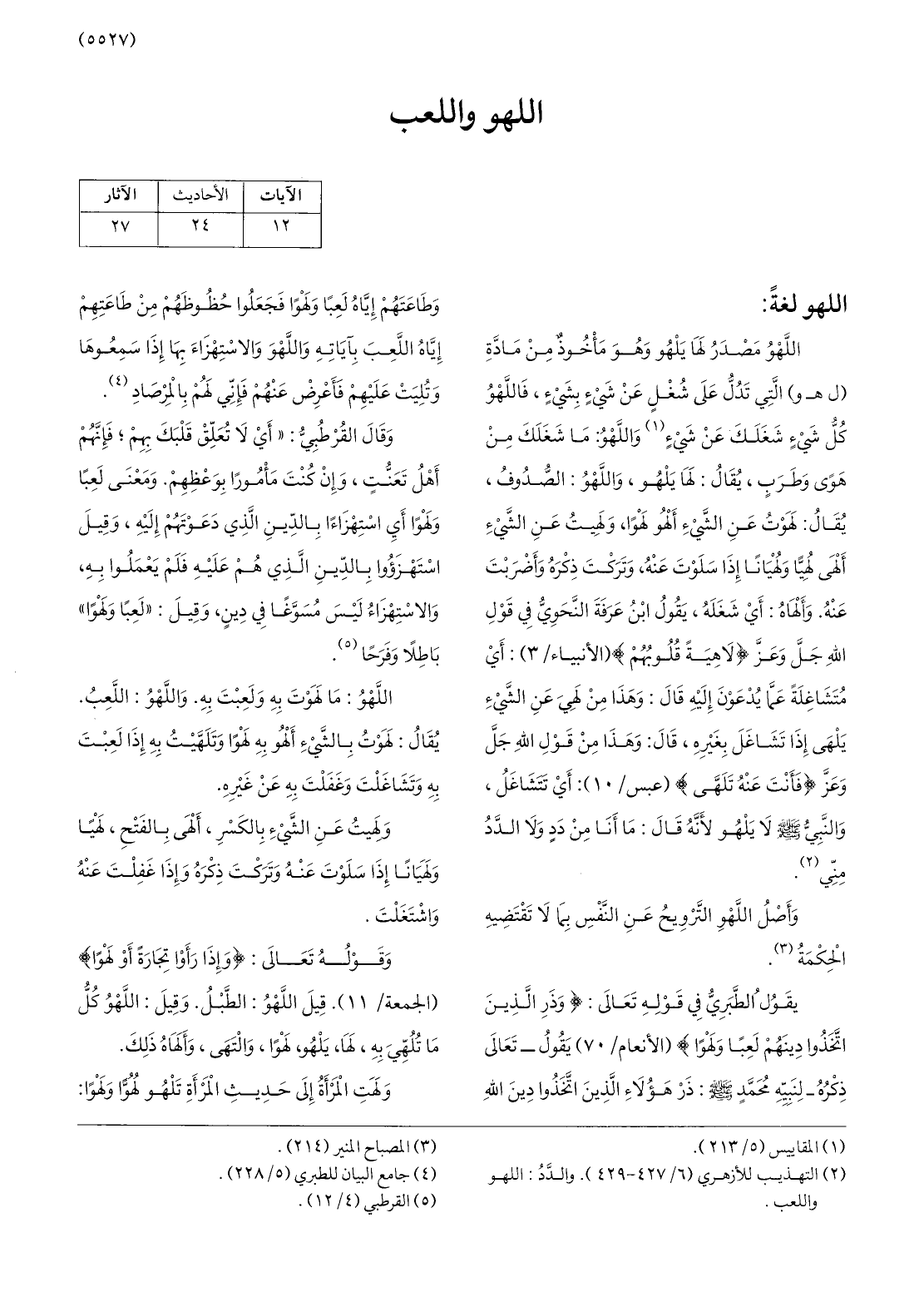 يقول الطّبريّ في قوله تعالى: وَذَرِ الَّذِينَ اتَّخَذُوا دِينَهُمْ لَعِباً وَلَهْواً (الأنعام/ 70) يقول- تعالى ذكره- لنبيّه محمّد صلّى الله عليه وسلّم: ذر هؤلاء الّذين اتّخذوا دين الله وطاعتهم إيّاه لعبا ولهوا فجعلوا حظوظهم من