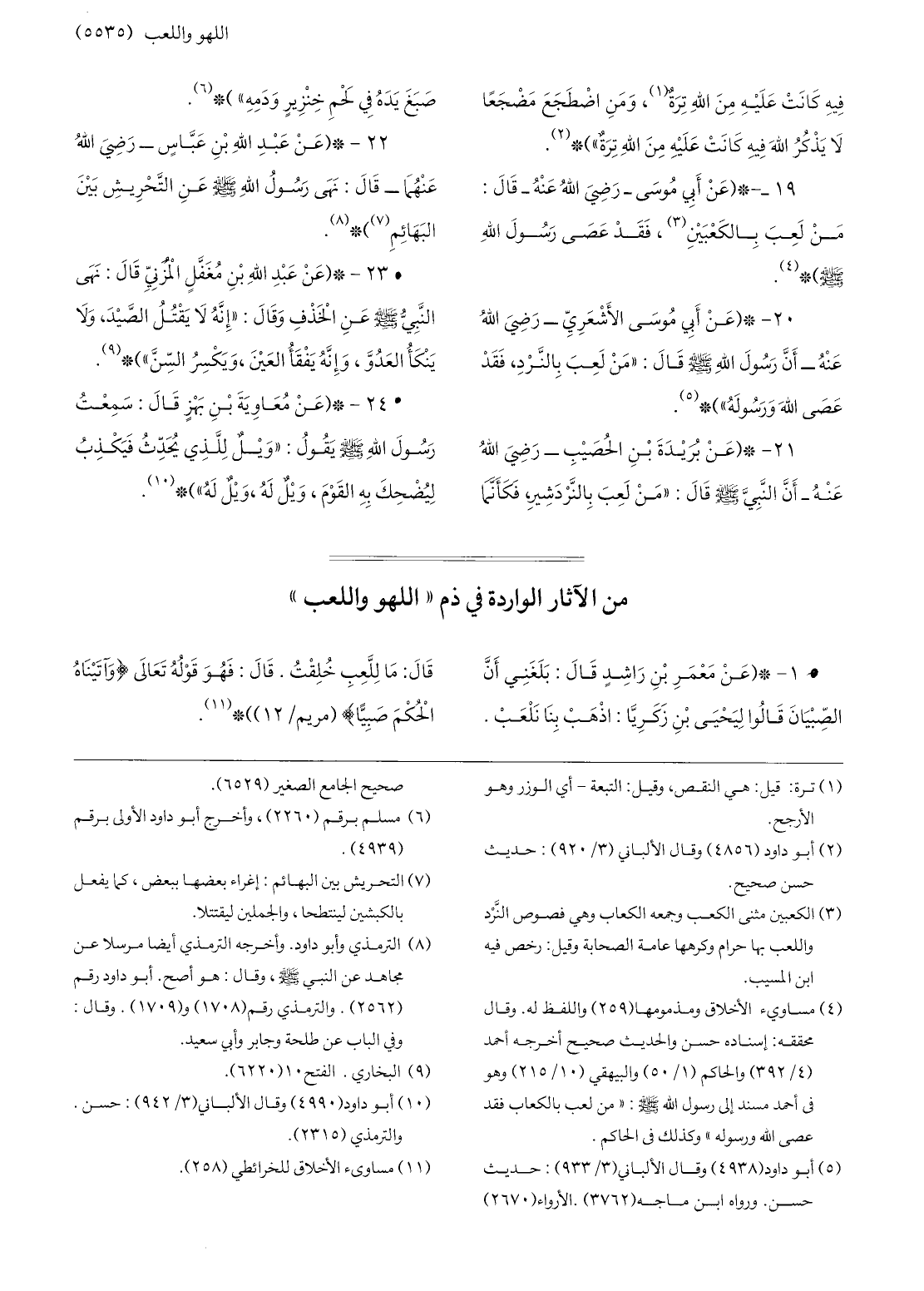 21-* (عن بريدة بن الحصيب- رضي الله عنه- أنّ النّبيّ صلّى الله عليه وسلّم قال: «من لعب بالنّردشير، فكأنّما صبغ يده في لحم خنزير ودمه» ) * «6» .
