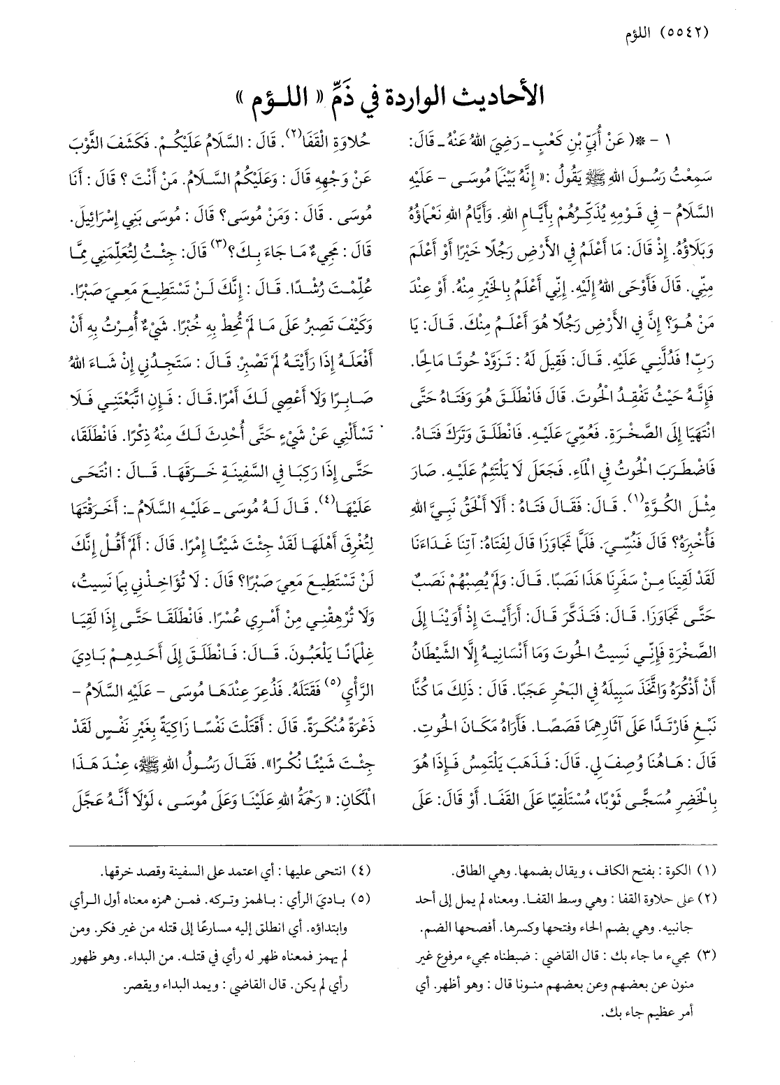 1-* (عن أبيّ بن كعب- رضي الله عنه- قال: سمعت رسول الله صلّى الله عليه وسلّم يقول: «إنّه بينما موسى عليه السّلام- في قومه يذكّرهم بأيّام الله. وأيّام الله نعماؤه وبلاؤه. إذ قال: ما أعلم في الأرض رجلا خيرا أو أعلم منّي. قال فأوحى الله إليه. إنّي أعلم بالخير منه. أو عند من هو؟ إنّ في الأرض رجلا هو أعلم منك. قال: يا ربّ! فدلّني عليه. قال: فقيل له: تزوّد حوتا مالحا. فإنّه حيث تفقد الحوت. قال فانطلق هو وفتاه حتّى انتهيا إلى الصّخرة. فعمّي عليه. فانطلق وترك فتاه. فاضطرب الحوت في الماء. فجعل لا يلتئم عليه. صار مثل الكوّة «1» . قال: فقال فتاه: ألا ألحق نبيّ الله فأخبره؟ قال فنسّي. فلمّا تجاوزا قال لفتاه: آتنا غداءنا لقد لقينا من سفرنا هذا نصبا. قال: ولم يصبهم نصب حتّى تجاوزا. قال: فتذكّر قال: أرأيت إذ أوينا إلى الصّخرة فإنّي نسيت الحوت وما أنسانيه إلّا الشّيطان أن أذكره واتّخذ سبيله في البحر عجبا. قال: