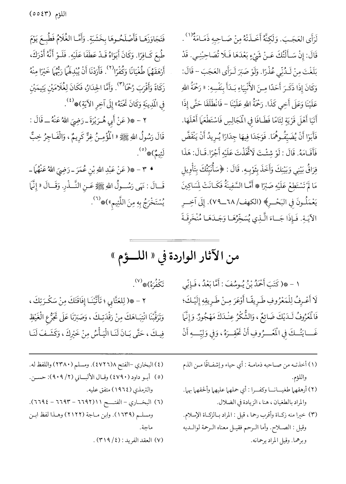 هذا فراق بيني وبينك وأخذ بثوبه. قال: سَأُنَبِّئُكَ بِتَأْوِيلِ ما لَمْ تَسْتَطِعْ عَلَيْهِ صَبْراً* أَمَّا السَّفِينَةُ فَكانَتْ لِمَساكِينَ يَعْمَلُونَ فِي الْبَحْرِ (الكهف/ 68- 79) . إلى آخر الآية. فإذا جاء الّذي يسخّرها وجدها منخرقة فتجاوزها فأصلحوها بخشبة. وأمّا الغلام فطبع يوم طبع كافرا. وكان أبواه قد عطفا عليه. فلو أنّه أدرك، أرهقهما طغيانا وكفرا «2» . فأردنا أن يبدلهما ربّهما خيرا منه زكاة وأقرب رحما «3» . وأمّا الجدار، فكان لغلامين يتيمين في المدينة وكان تحته» إلى آخر الآية) * «4» .