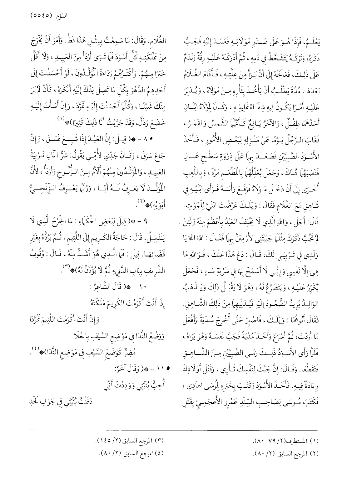 يعلم، فإذا هو على صدر مولاته فعمد إليه فجبّ ذكره، وتركه يتشحّط في دمه، ثمّ أدركته عليه رقّة وندم على ذلك، فعالجه إلى أن برأ من علّته، فأقام الغلام بعدها مدّة يطلب أن يأخذ بثأره من مولاه، ويدبّر عليه أمرا يكون فيه شفاء غليله، وكان لمولاه ابنان أحدهما طفل، والآخر يافع كأنّهما الشّمس والقمر، فغاب الرّجل يوما عن منزله لبعض الأمور، فأخذ الغلام الصّبيّين فصعد بهما على ذروة سطح عال فنصبهما هناك، وجعل يعلّلهما بالمطعم مرّة، وباللّعب أخرى إلى أن دخل مولاه فرفع رأسه فرأى ابنيه في شاهق مع الغلام فقال: ويلك عرّضت ابنيّ للموت.